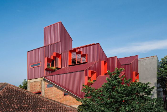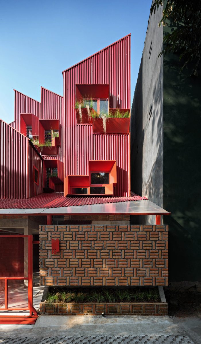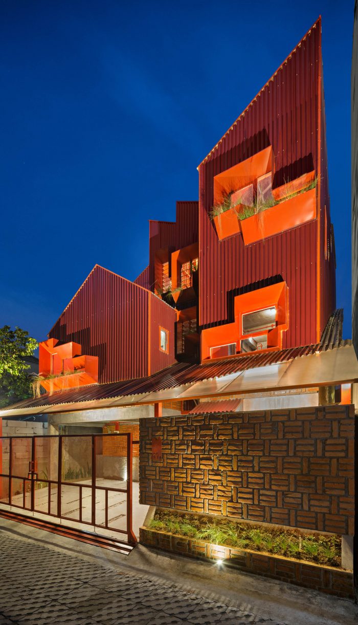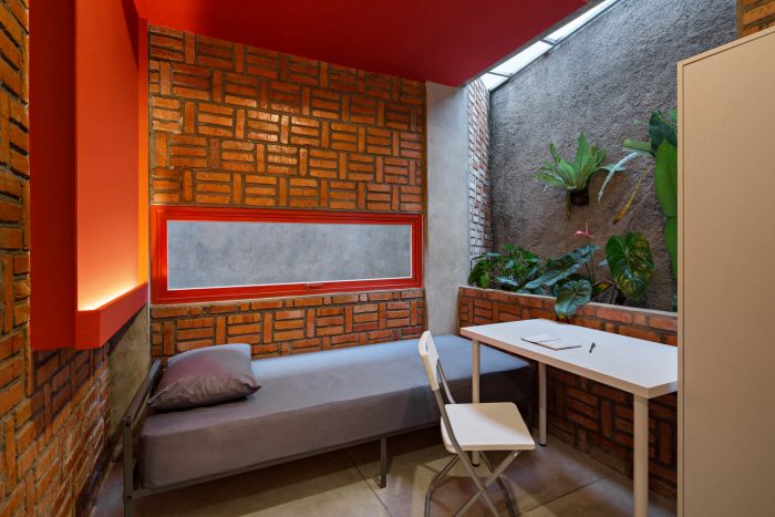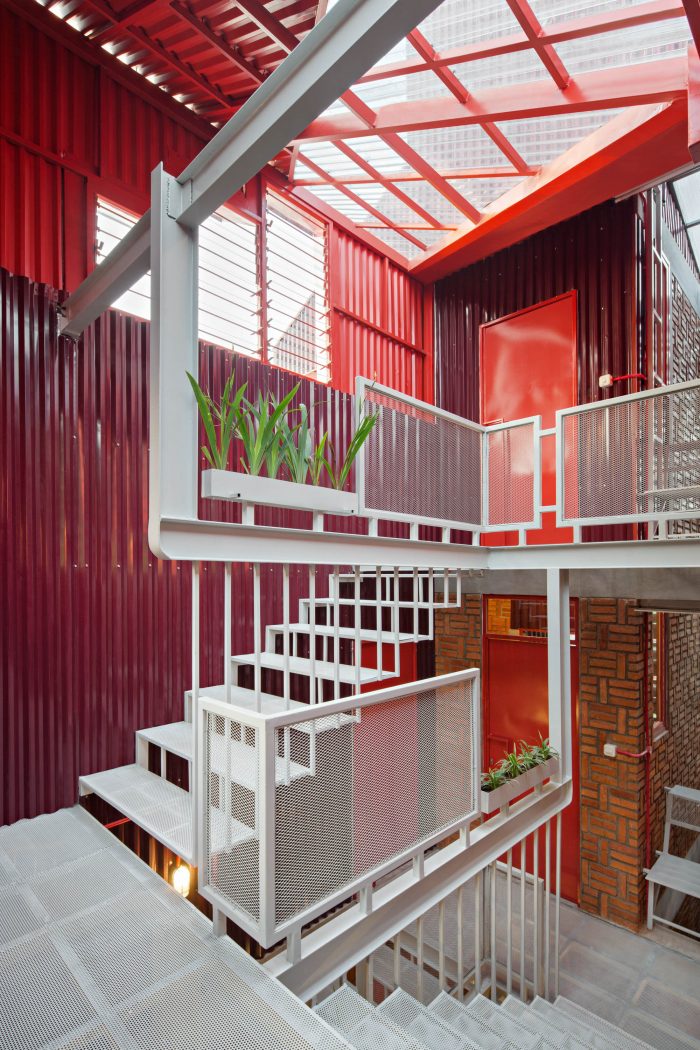Details & Material - The stair is the only one access to the unit, sculpturally designed by a suspended structure using steel and iron. It shows a hanging stair system structure that gives an iconic and memorable experience for the residents. Steel perforated flat on the stair’s footstep makes the light from the skylight and its shadows can move through and highlighting the combined texture between exposed brick and red metal wall and make stronger the room characteristic that continues with exterior design.