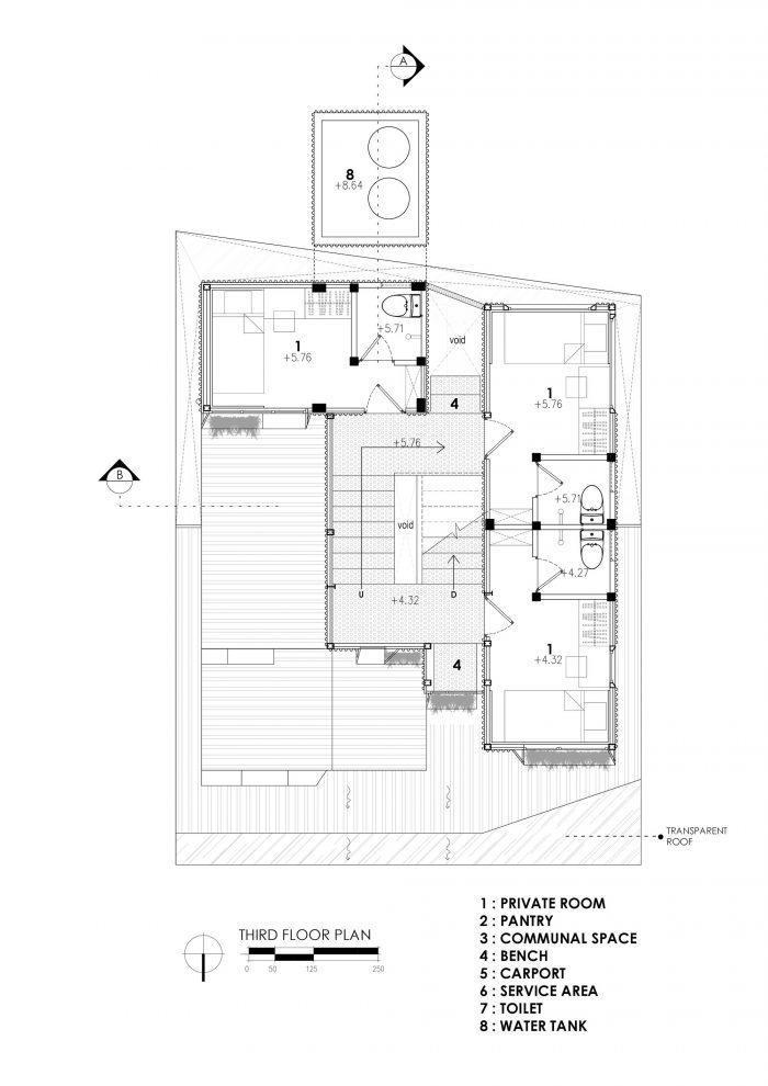 At the same time, stacked masses with fragmented roofs become another response for the tropical climate that potentially having more air circulation to the inside of the building. Another strategy is making a setback distance on every side of the mass so the mass won’t adhere to the other building around and it also formed a void. The emptiness of the pilotis mass connects to the void in the middle green space that also a staircase and green space on the back of the site. These 2 areas were placed between every unit and it became a source of air and sunlight, it maximized by the perforated footstep that air and light can be pass-through from the pilotis mass and skylight. The empty space formed by pilotis mass become some support area for the resident such as parking area, communal space, pantry and laundry area.