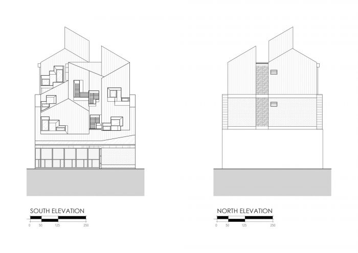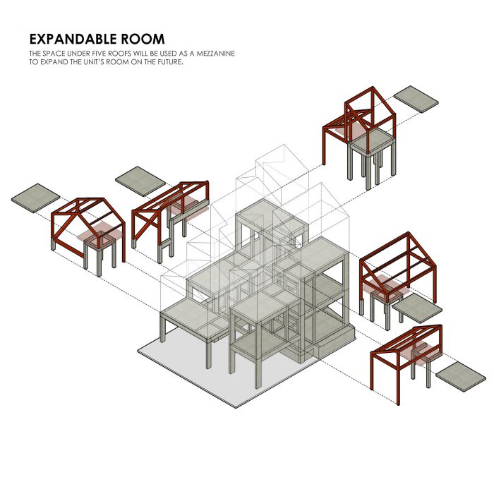 Massing & Passive Design Strategies - The function and location which is a multi-dwelling between residential areas become the idea for the building form, we want this building imaging a cumulative stacked house. We implement this image through the stacked mass formed by the main circulation, this implementation formed a split-level space. Then, the fragmented sloping roof that follows each unit’s grid below makes the image stronger. The space under those roofs will be used as a mezzanine to expand the unit’s room in the future.