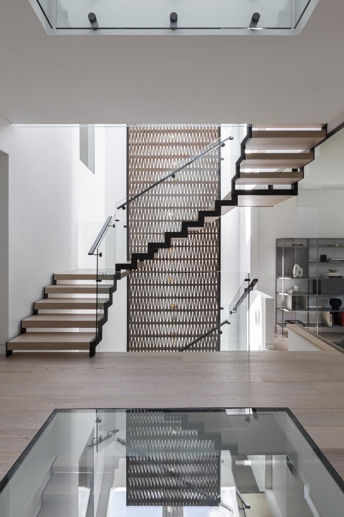 Located between the ground floor and the second floor, the multi-purpose room is a diagonal extension of the living room below and across as well as a distinct gathering space shared by the three bedrooms on the second floor. From the living room, this diagonal sightline continues to the transparent wine cellar and the feature garden in the basement. Unlike the clear delineation of the blocks on the exterior, the interior is a vertical labyrinth around the staircase, generating a constant motion either in body, eye, or mind, throughout the entire stack of the house.