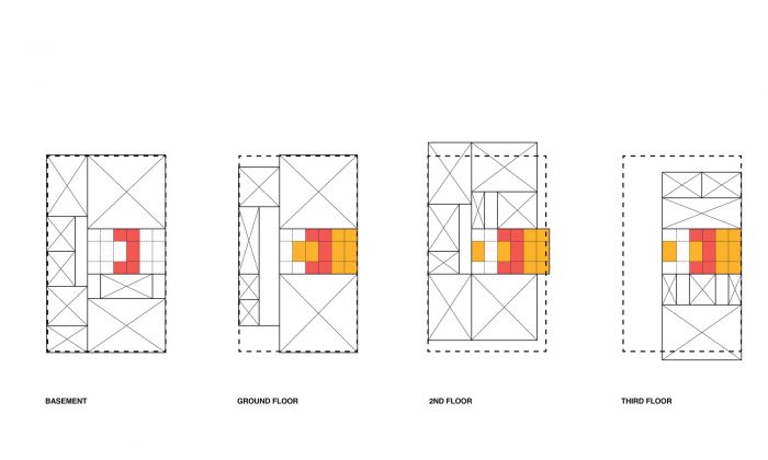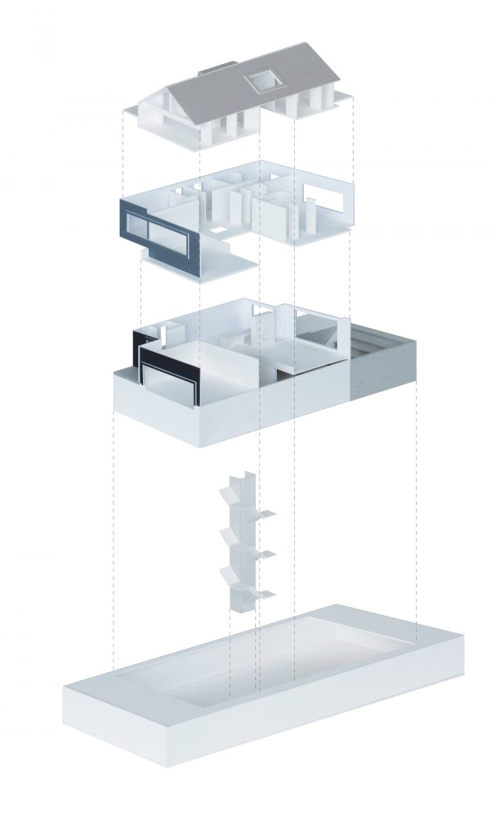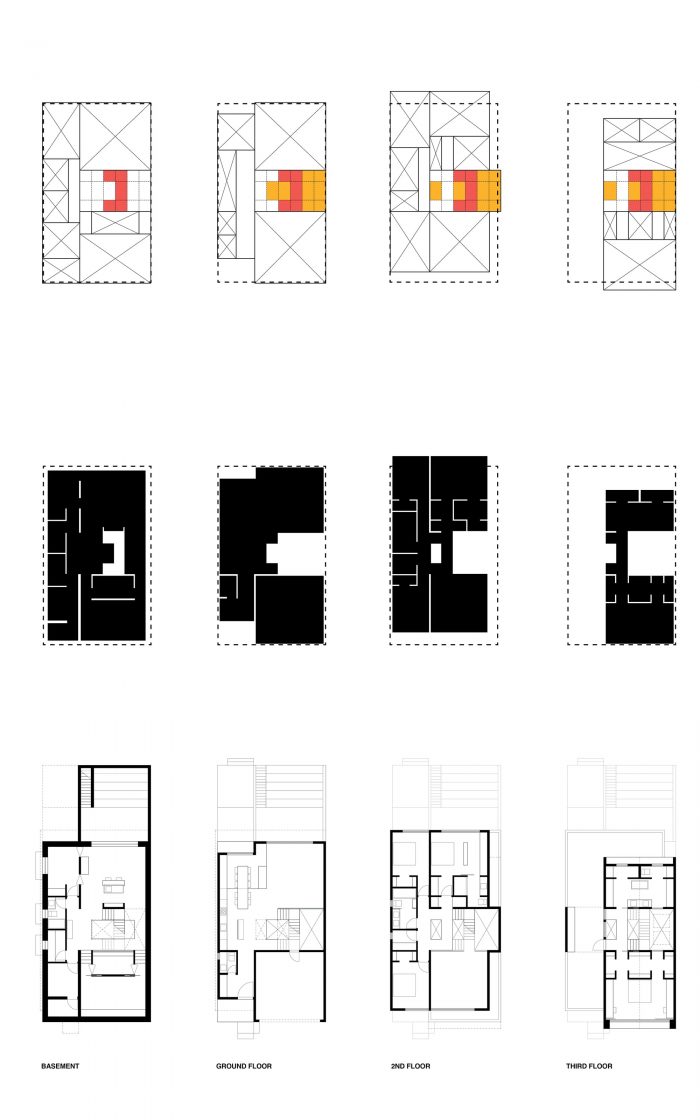A building is like a pile of books, which, being scaled and sized to our human body, is composed of horizontal platforms with consistent ceiling heights. A tall structure of three stories plus a basement, Stack House is a playful expression of horizontal volumes, which are stacked on top of and cantilevered from each other.