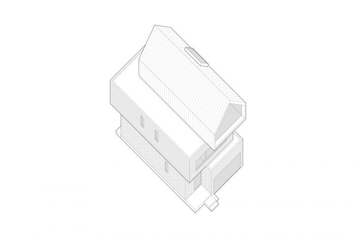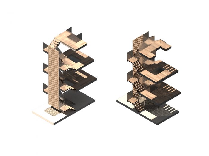 The stack is composed of three “blocks”. The lower block, containing the public programs, is finished in stucco. The middle block, containing the transitional programs, such as the multi-purpose room on the mezzanine level, is finished in charred wood. The upper block, containing the most private programs, such as the master bedroom and ensuite, is finished in metal paneling.