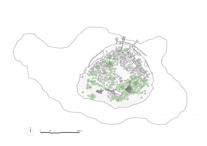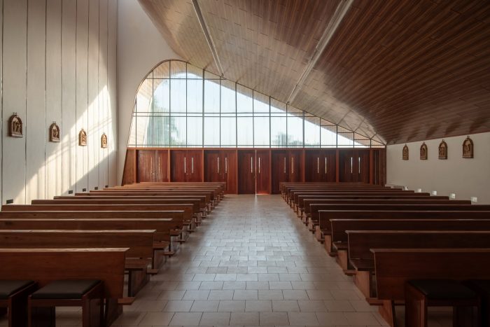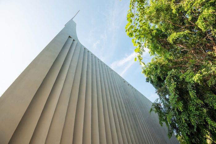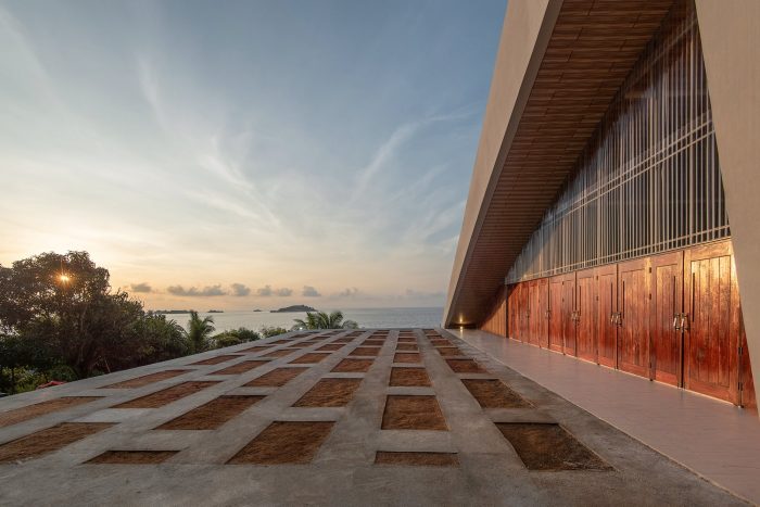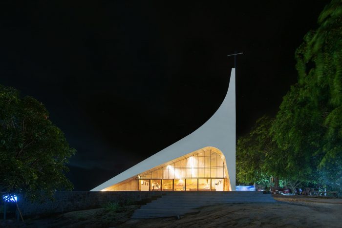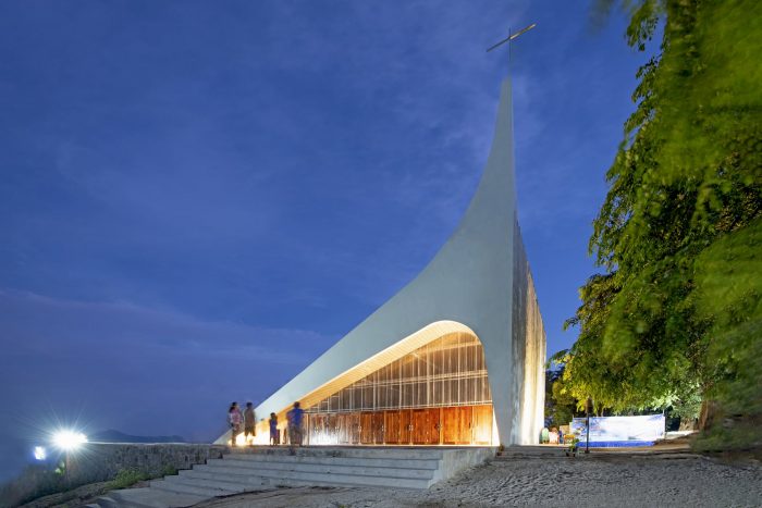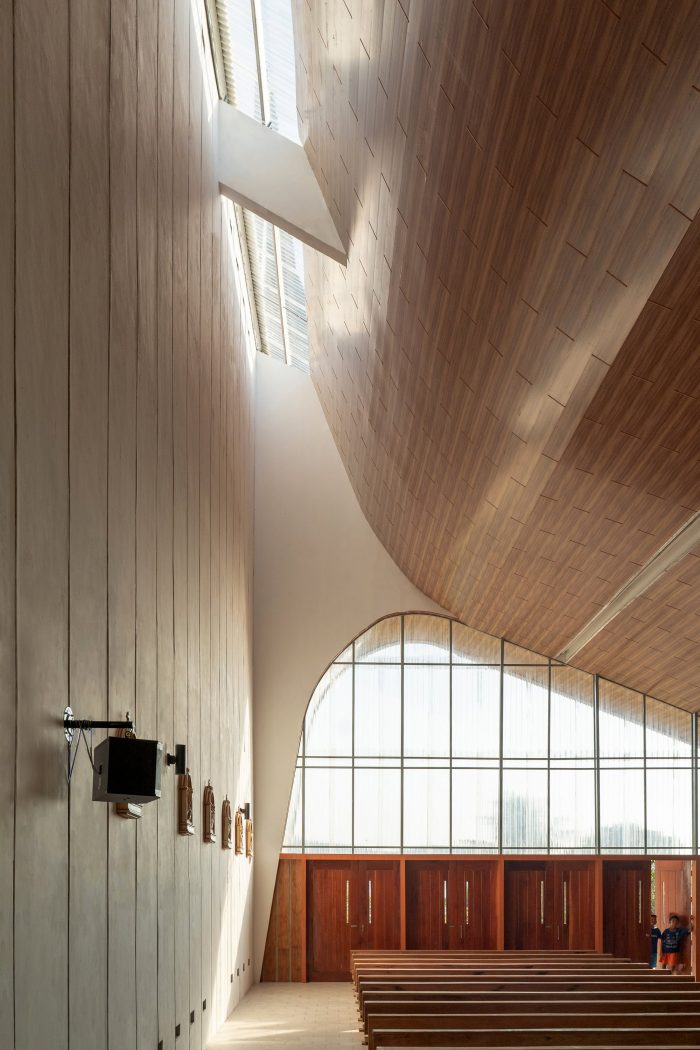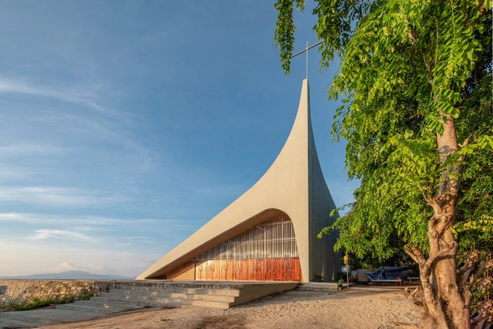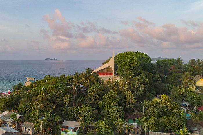 The site is located at the highest point of the island. Besides the trees, nothing separates the church from the natural elements, especially the wind. Therefore, the design started with how to respond to the strong wind that comes from the ocean side. The church was designed with the lowest point facing the ocean and gently rising toward the inland, creating a triangle profile as a base design. This way, the wind will gently sweep through the roof surface, as opposed to hitting it hard if a vertical wall was to be built facing the ocean. The final form of the church was designed to be a simple icon that can be interpreted as an ocean wave, or it can also be seen as a boat, both of which are closely related to the Mengkait people.
