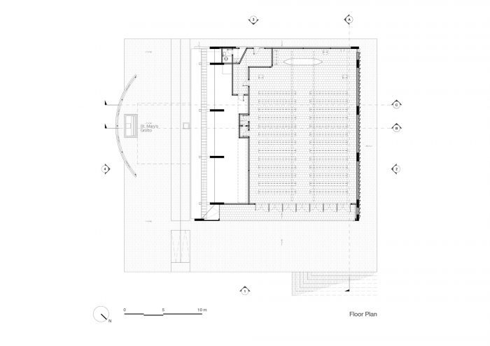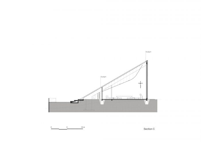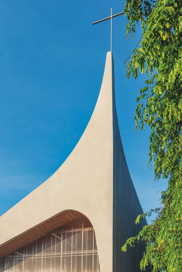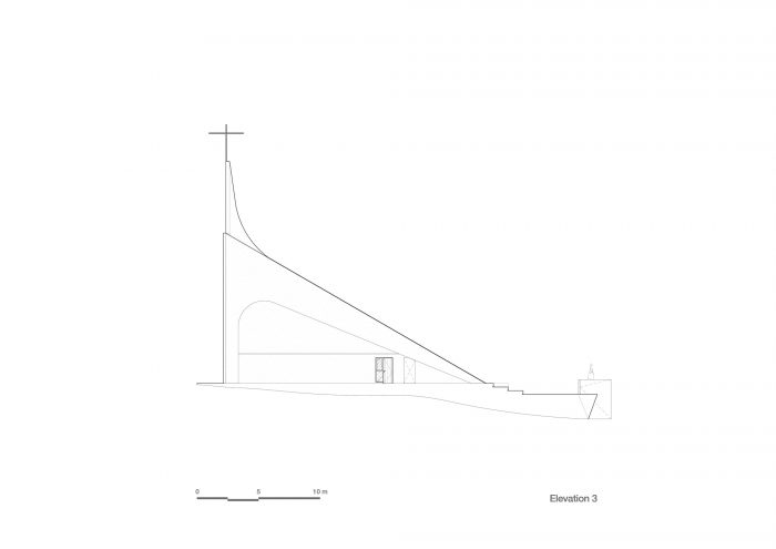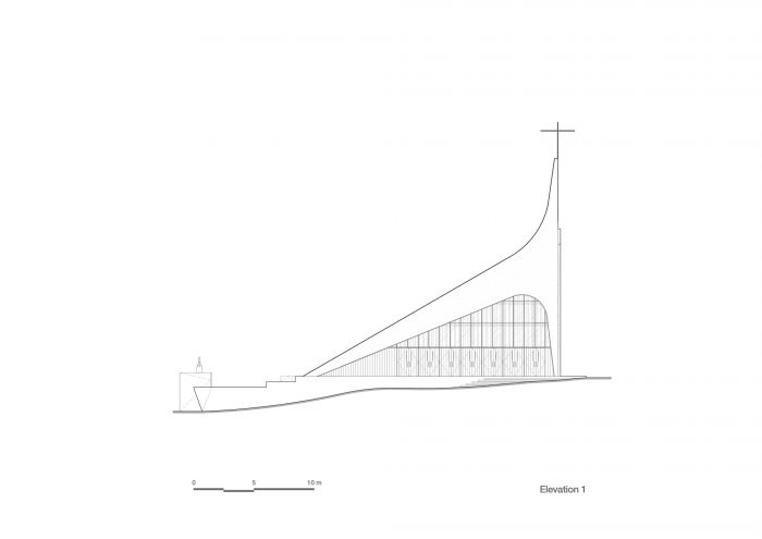 场地位于该岛的最高点。 除了树木之外,没有任何东西能将教堂与自然元素分开,尤其是风。 因此,设计的出发点是如何应对来自海洋一侧的强风。 教堂被设计成最低点朝向海洋,并向内陆缓缓上升,形成一个三角形的轮廓作为基础设计。 这样一来,风就会轻柔地掠过屋顶表面,而不是像面向海洋的垂直墙那样猛烈地撞击屋顶。 教堂的最终形式被设计成一个简单的图标,可以被解释为海浪,也可以被看作是一艘船,这两者都与孟凯特人密切相关。