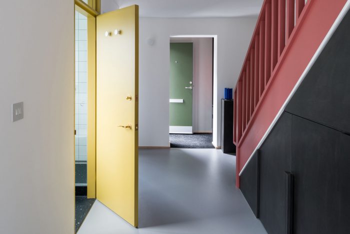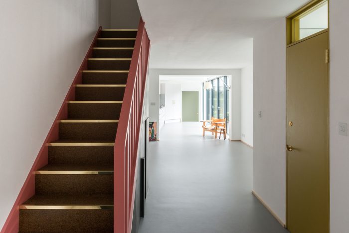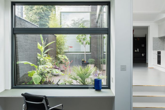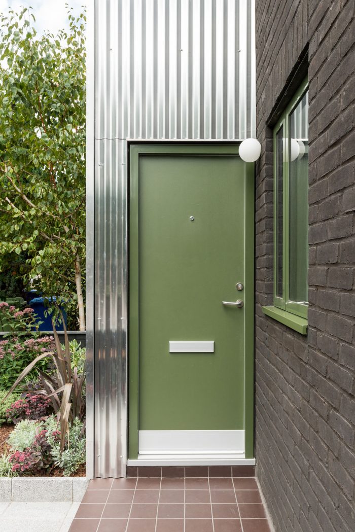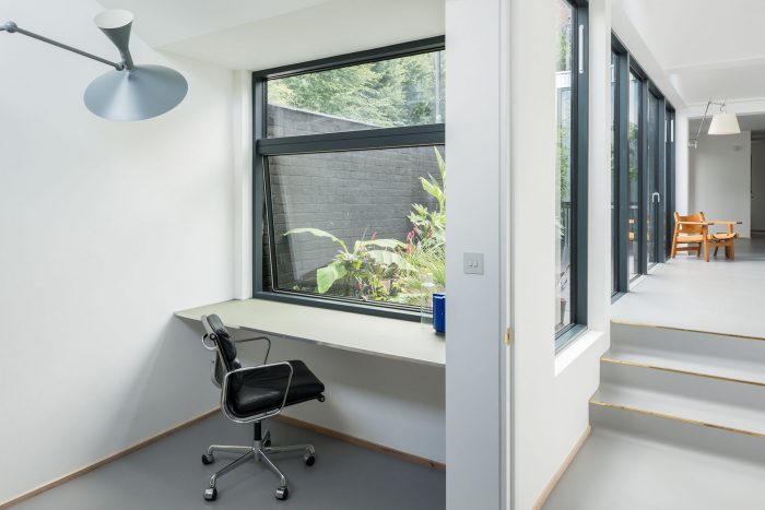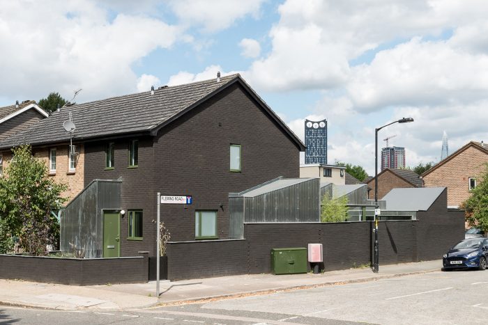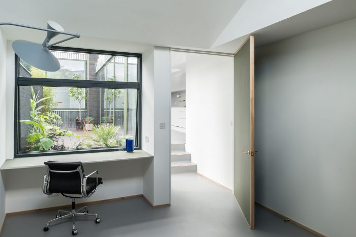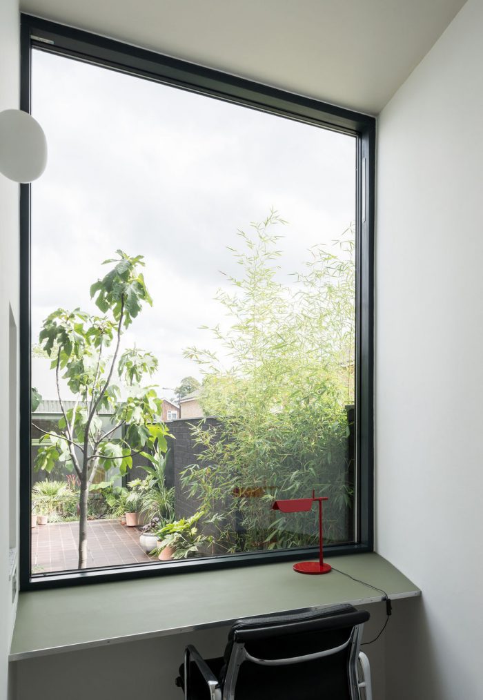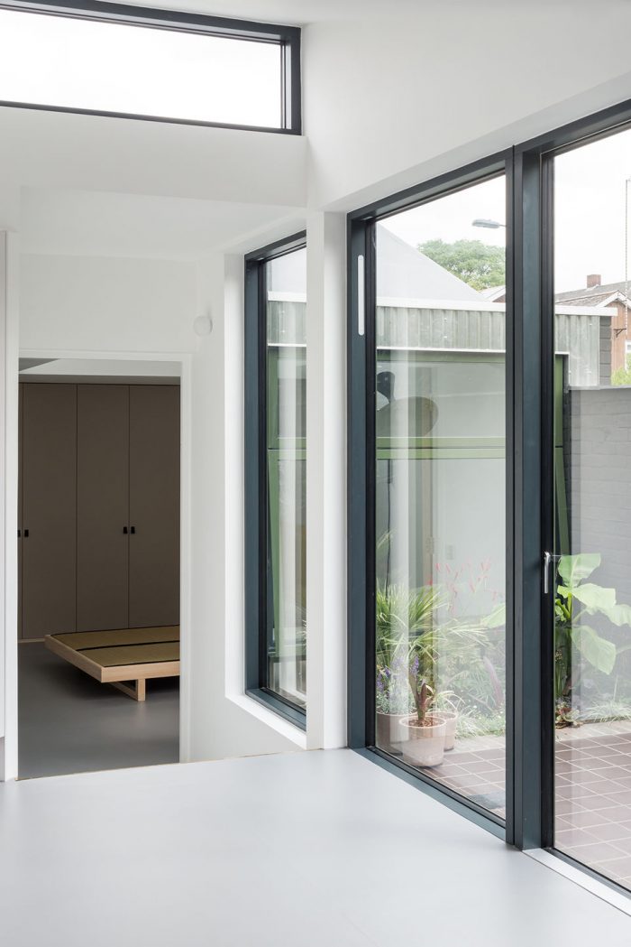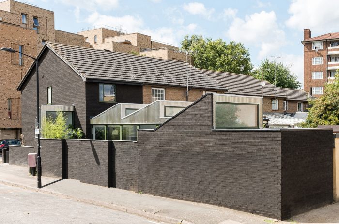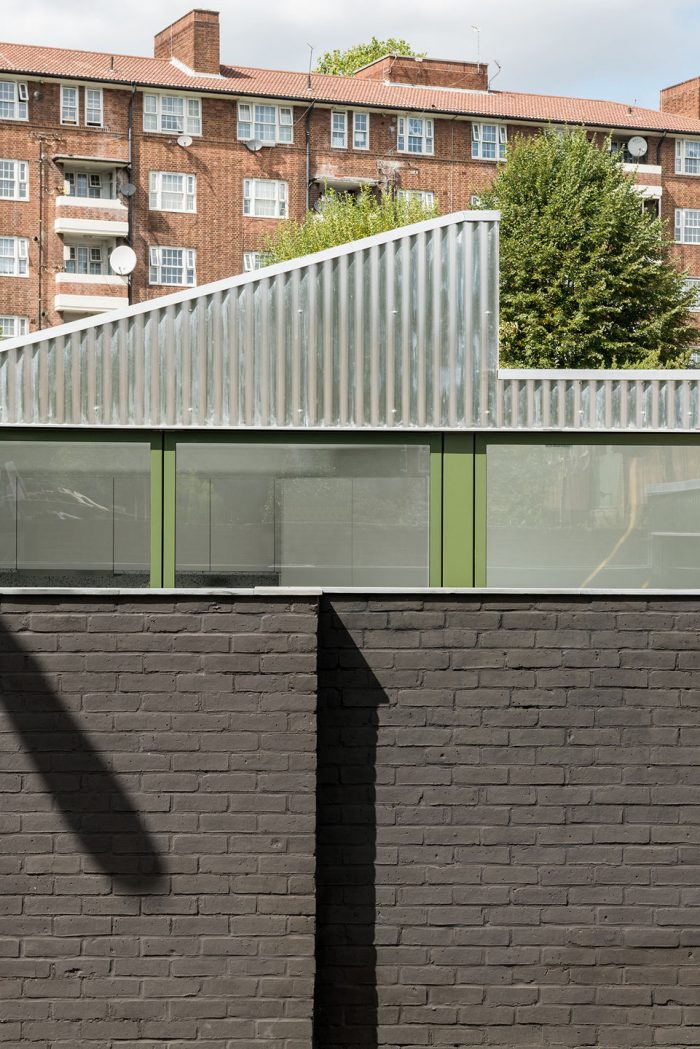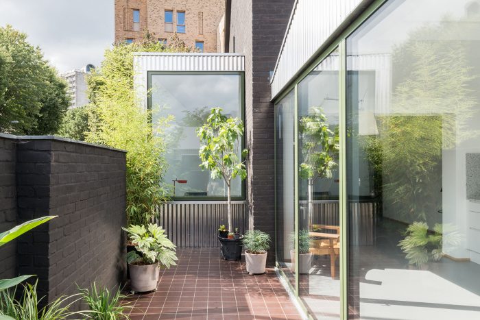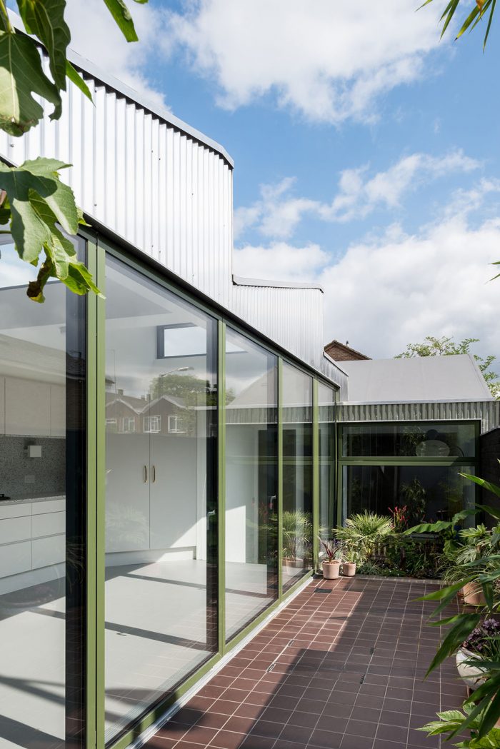 Stego is a minimalist residence located in London, United Kingdom, designed by Archmongers. Stego is the refurbishment and extension of a 1980s end-of-terrace house in south London. The project connects the main property to a bedroom converted from a garage, via a single story courtyard extension. The exterior brick stain unifies the new walls with the old, distinguishing the house from the rest of the terrace. The corrugated aluminum emphasizes the pitched forms of the roof while the material reflects the surrounding urban landscape, vegetation and sky, changing with the light. The home evokes the client’s peripatetic childhood. It creates a private landscape of views through large courtyard doors and foliage into light-filled rooms, creating its own context juxtaposed with the urban grain of London beyond.