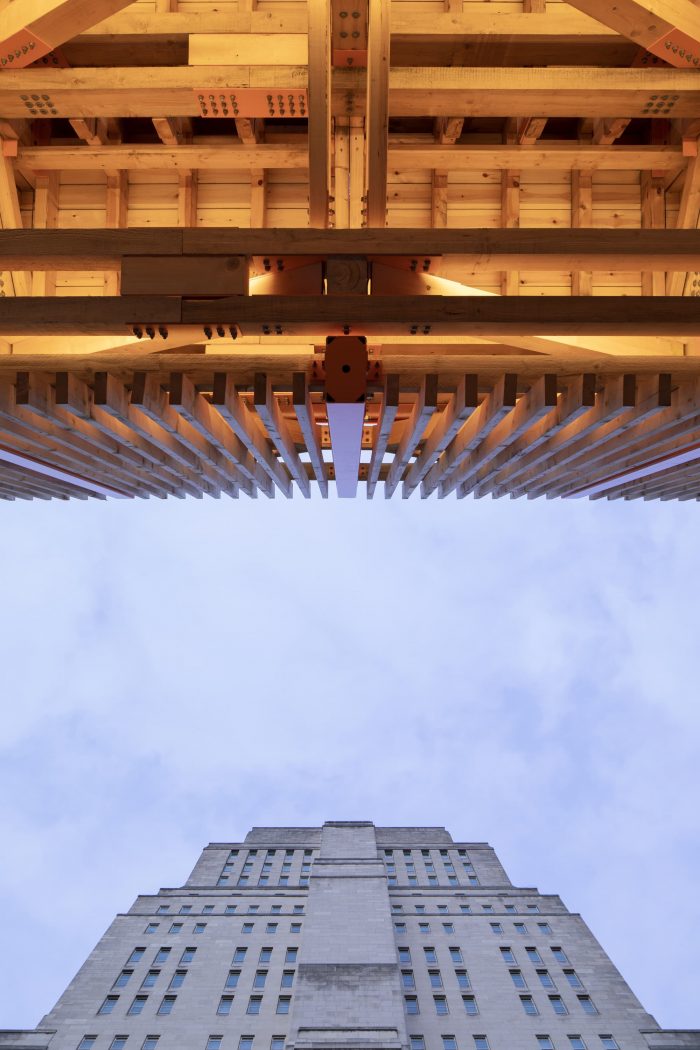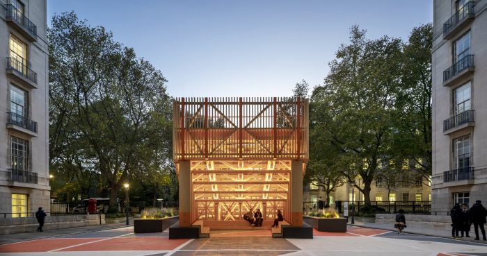 The materials were used with sustainability and demountability in mind and the pavilion will stay in place, as a temporary structure, for a minimum of three years. It is designed using C24 softwood and European whitewood timber with concrete blocks used to plant the pavilion in place. Steel beams provide a level base for the timber structure, and steel plates are used for the connections and for easy disassembly with steel mesh screens and steel handrails incorporated. Additional timber and plywood planters are installed around the edge of the structure.
