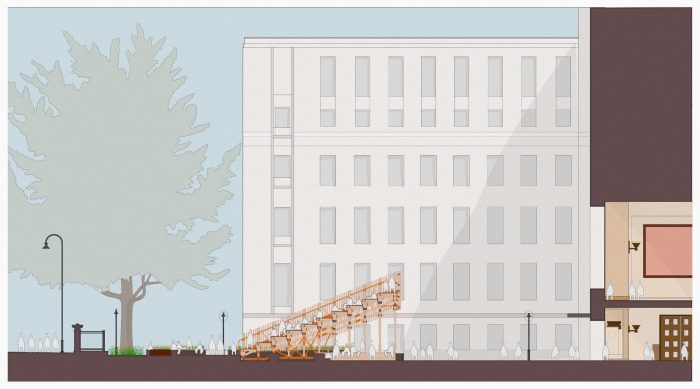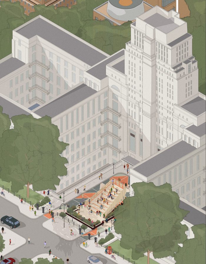 BDP’s multidisciplinary team was asked to design a creative, social environment that transforms the car park on the west side of the central tower into a social space while highlighting and enhancing the horseshoe layout of Senate House, continuing its symmetrical language and encouraging activity. The structure would create a sense of belonging and become a place where students would want to stay and relax with their peers.