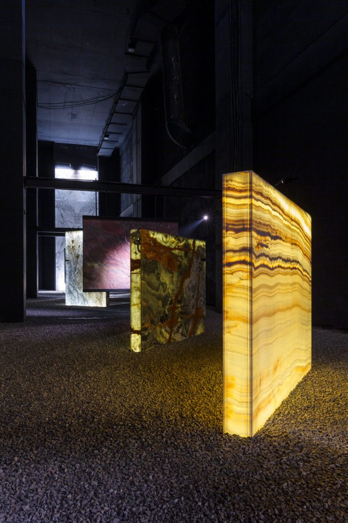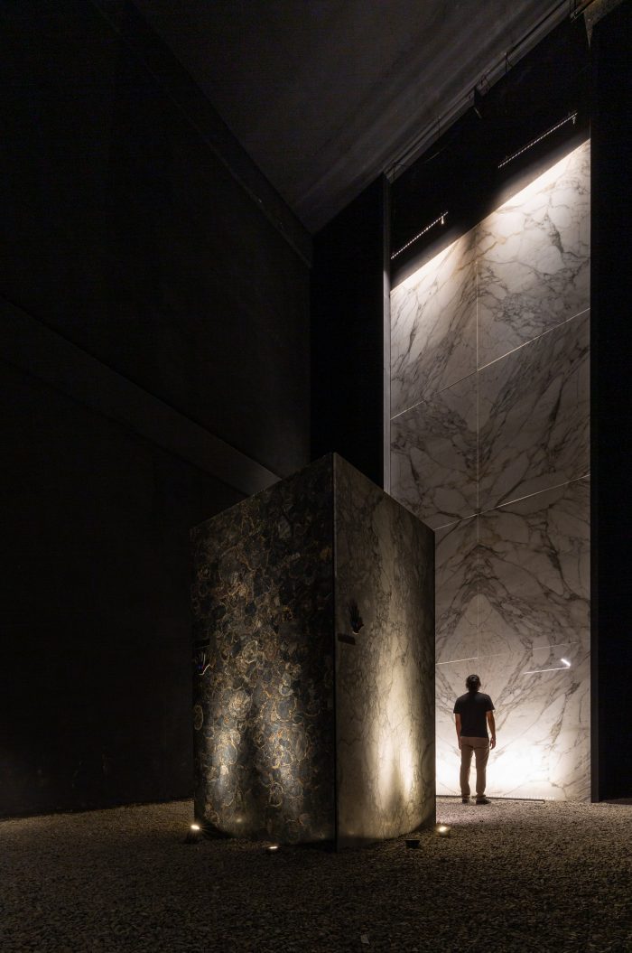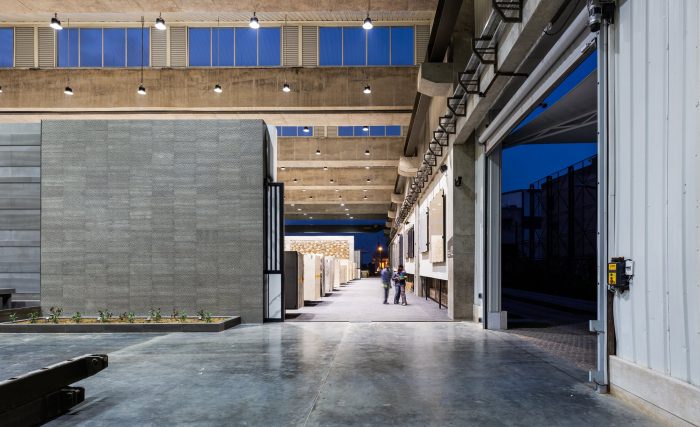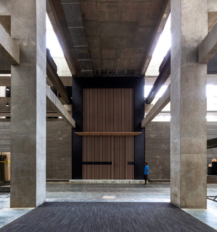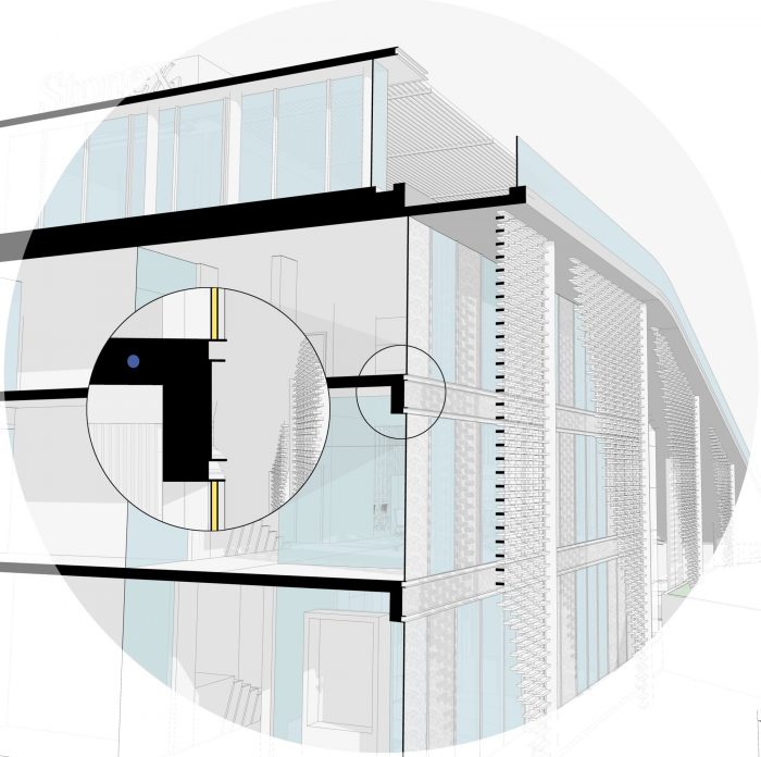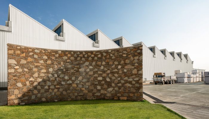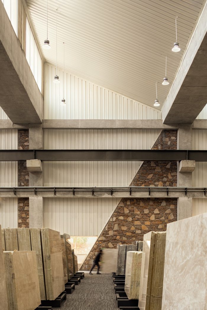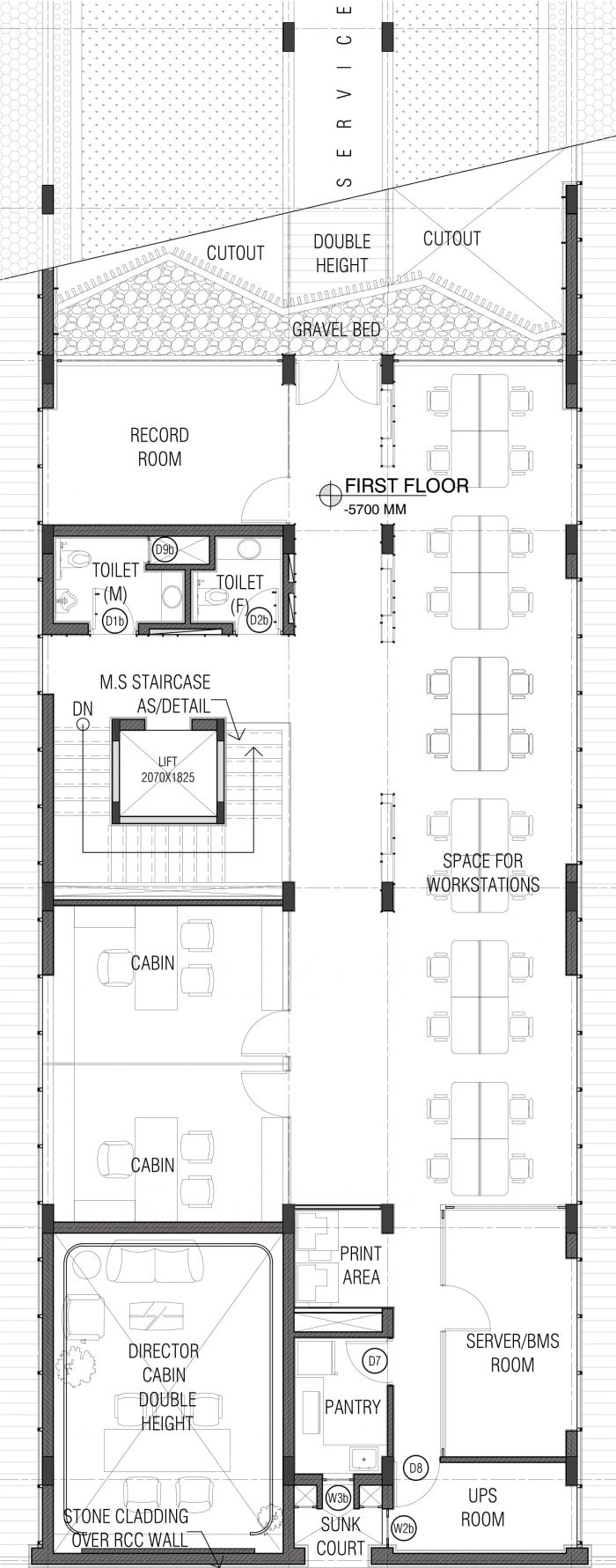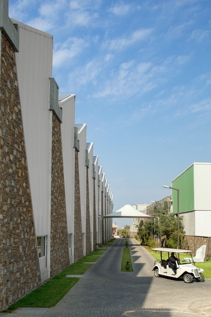 Also, this has led to HVAC load cutting by almost 40%. The floor slabs are additionally radiant cooled to regulate temperatures. The skin of the Office building sandwiches a puff panel between two laminam panels to further insulate the interiors. The façade is complimented by an enveloping stone screen that is fabricated using the waste stone from a nearby quarry and the stone wastage that is generated on site. This screen provides solar shading from the south-east and west glare. A playful, visual appeal is created by the light and shadow of interwoven stone blocks that appear to be floating at different levels.
