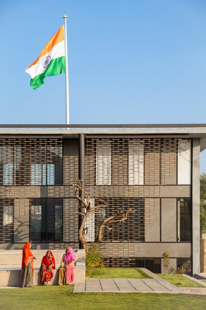 因此,建筑体量和地面被打穿,以创造出下沉式庭院,并在土层冷却的下层建立一个露天剧场。由于部分位于地下,这个古怪的建筑群定义了一个无缝的轮廓,由石头和绿色植物组成的屏风装饰着整个屋顶,一扫而空。拉贾斯坦邦炎热干燥的气候被这个部分下沉的建筑所抵御,在夏季保持凉爽,在冬季保持温暖。这是由地球护堤和地球耦合的自然现象实现的。室内的温度在辐射冷却的帮助下被调节,使建筑的运行成本提高了60%。