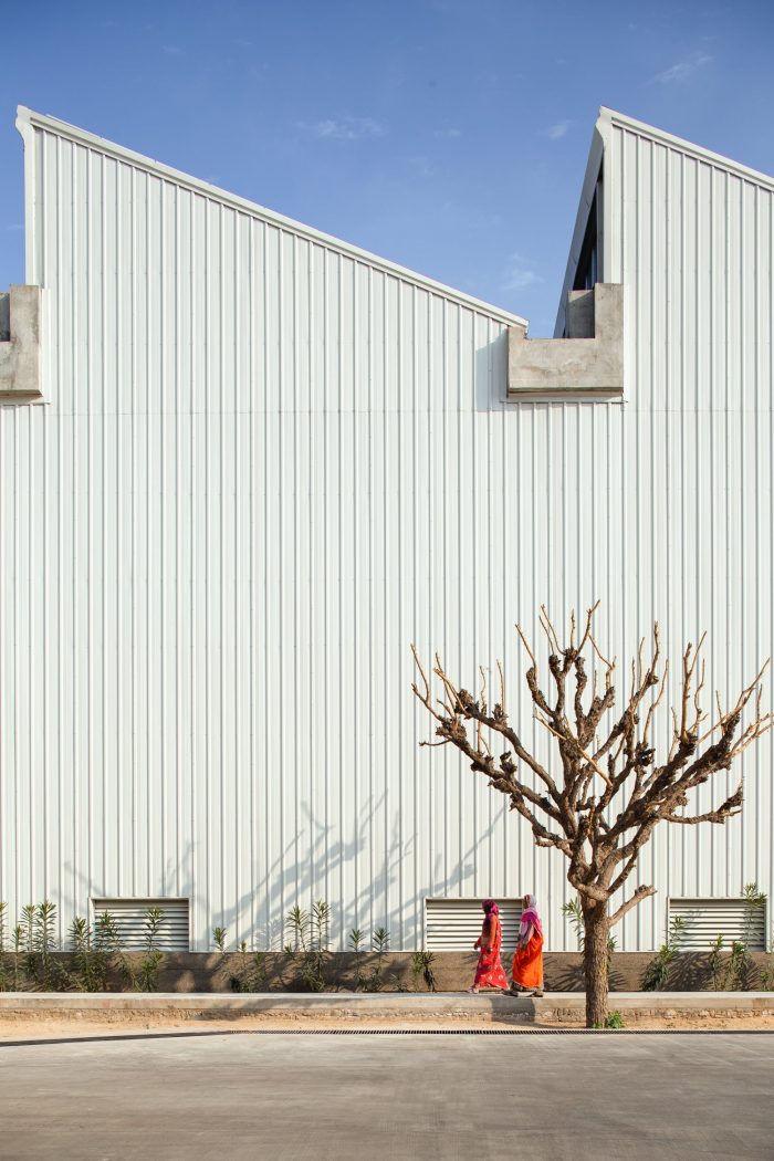 The sides facing east and west are mostly blank, barring the small windows that connect the occupants with the surroundings. The windows also create a wind draft across the height of the shed expelled through the ventilators along the north light trusses therefore avoiding hot pockets at the top and effectively cooling the building by about 10-12 degrees. The building is designed such that the spaces are used judiciously, allowing for maximum possible green cover and softscaping.
