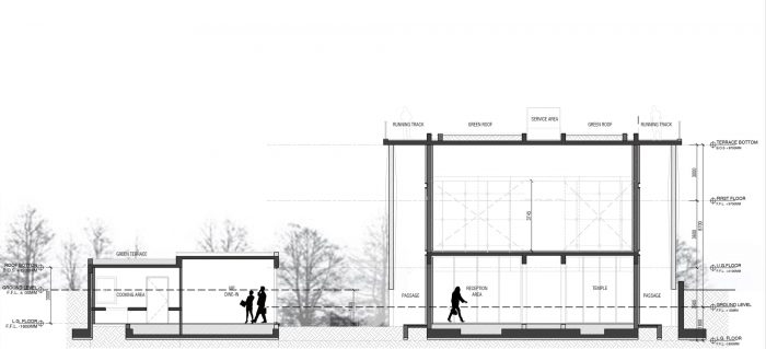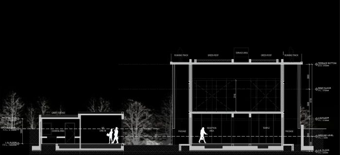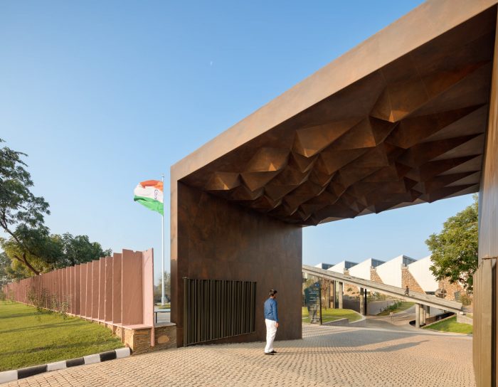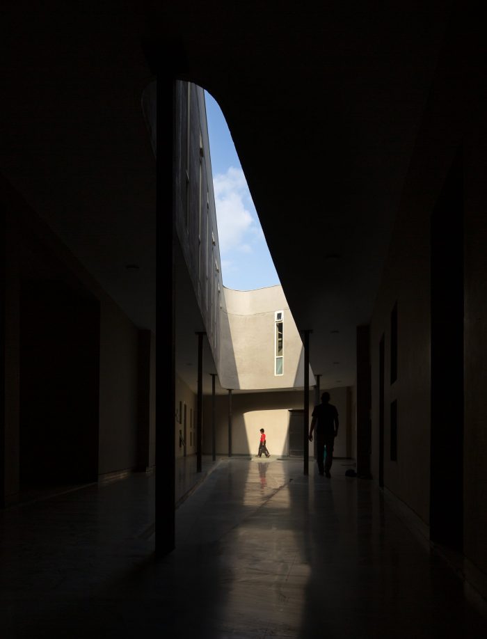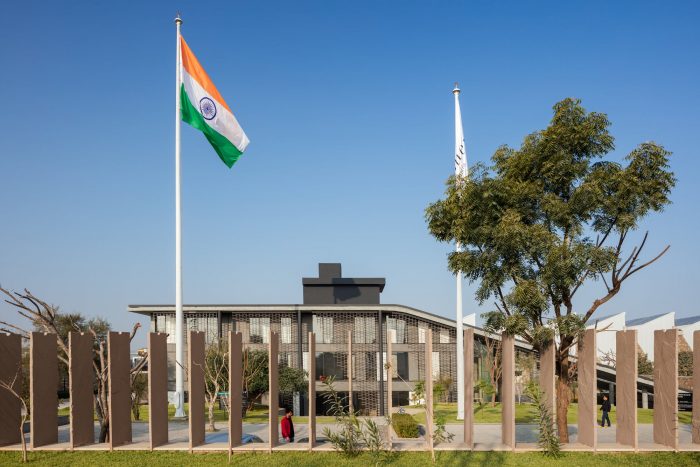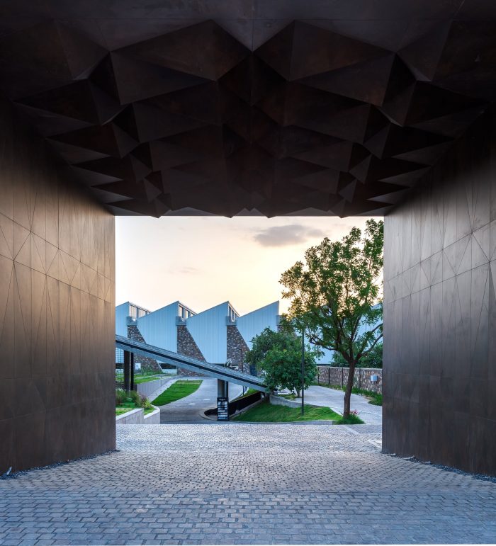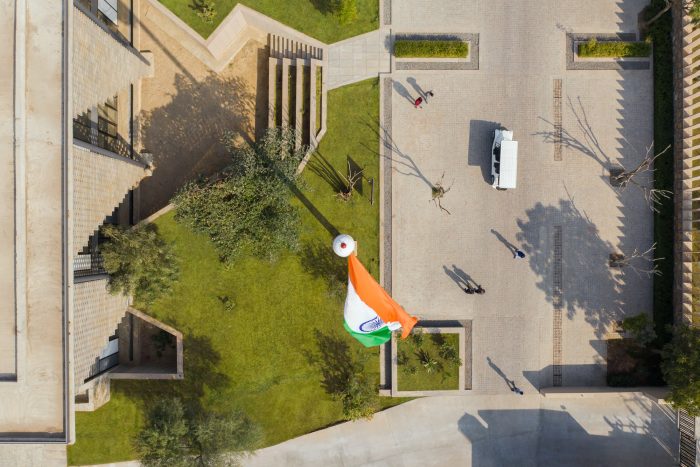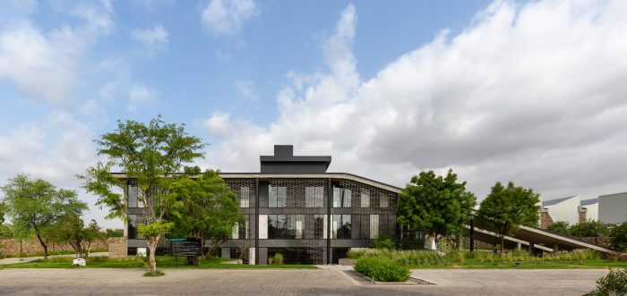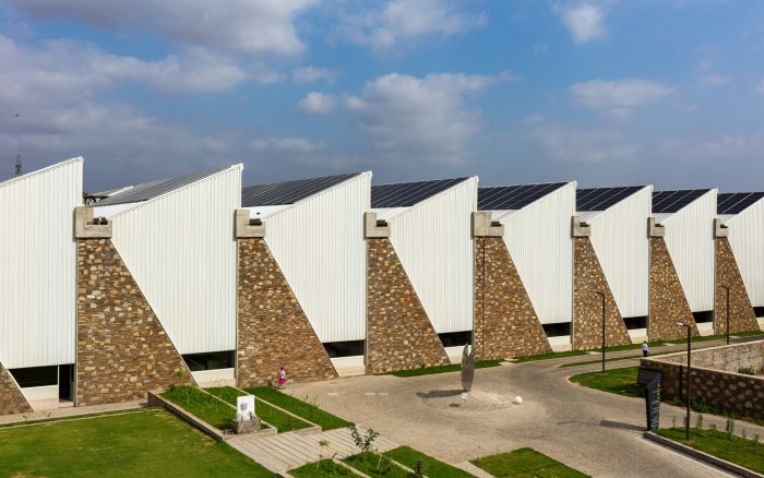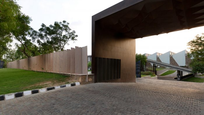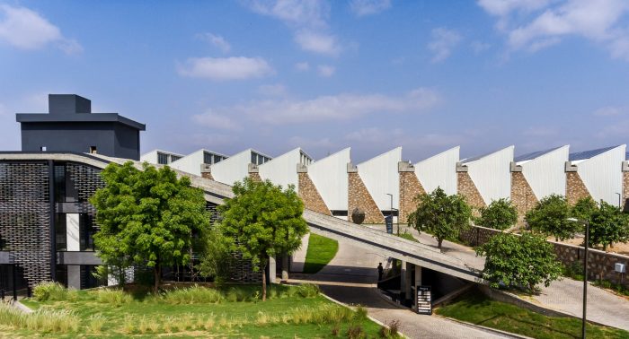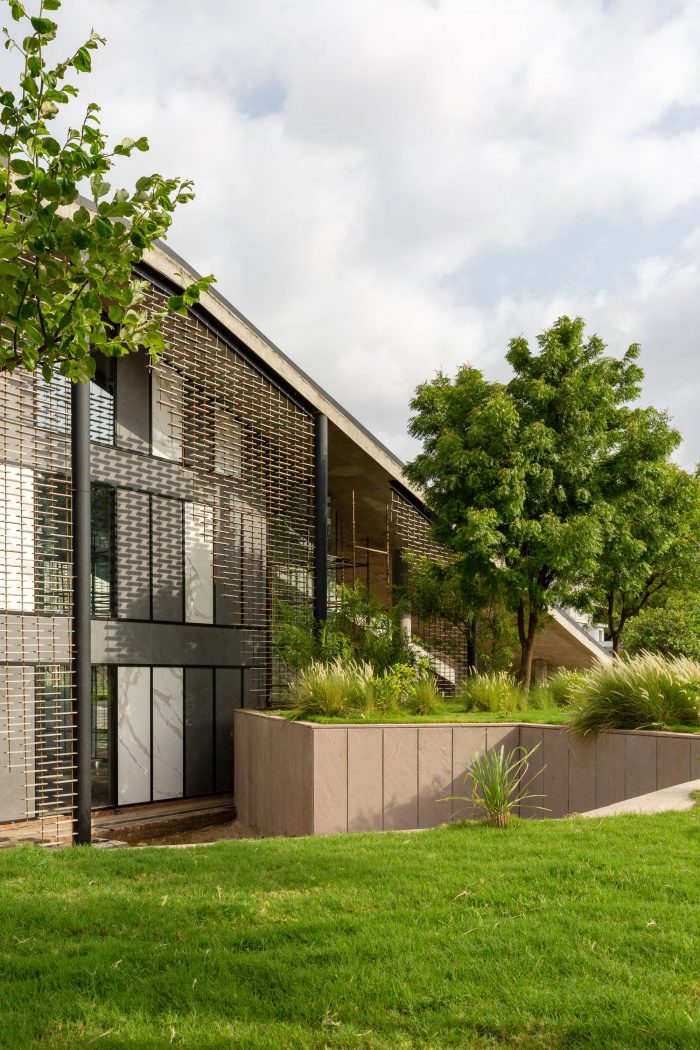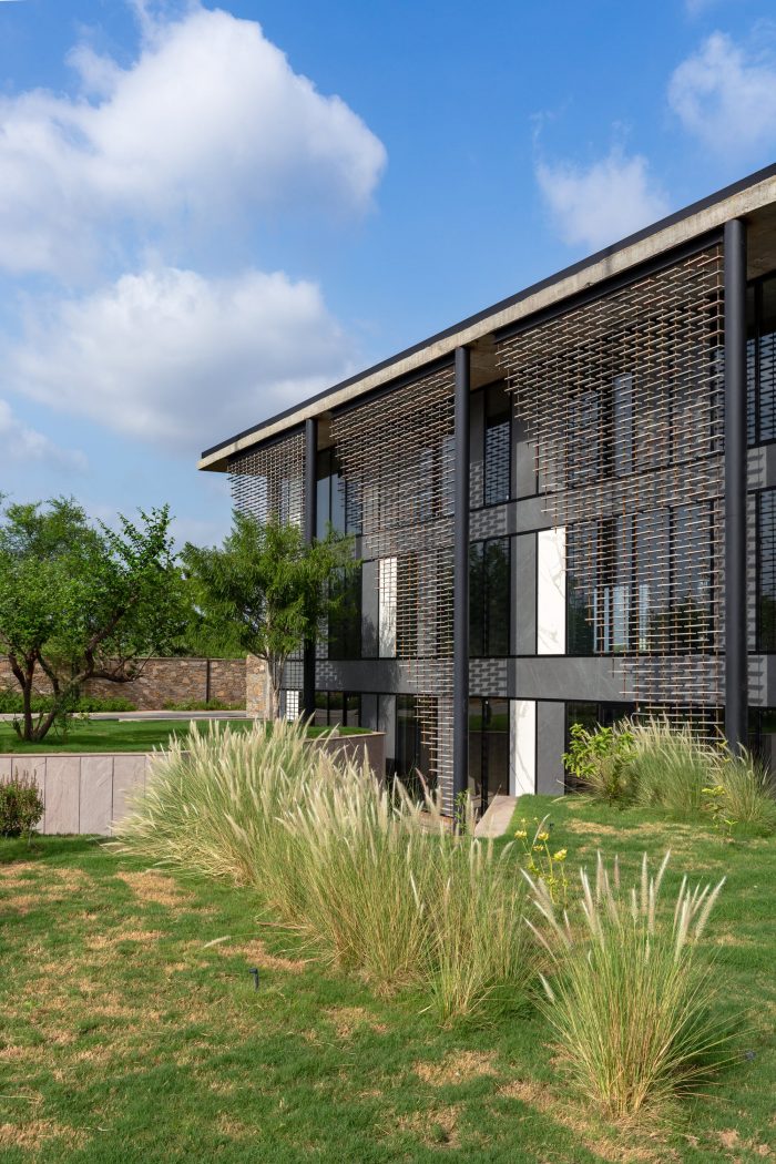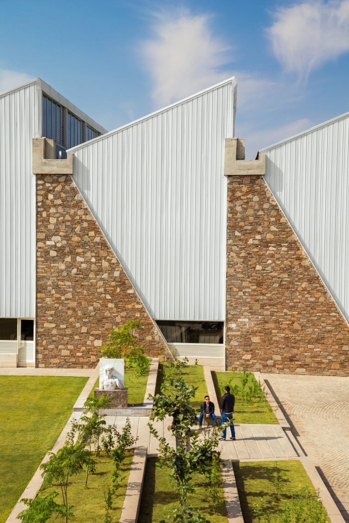 Consequently, the built mass and the ground is punctured to create sunken courtyards and an amphitheater within the earth-cooled lower floor. Being partly underground, the eccentric mass defines a seamless silhouette adorned by screens in stone and greenery climbing up the entire roof in a sweep. The hot and dry climate of Rajasthan is combated by the partly sunk mass, staying cool during summers and warm during winters. This is achieved by the natural phenomena of Earth Berming and Earth Coupling. The temperatures indoors are regulated with the help of radiant cooling, allowing for a 60% efficiency in the running cost of the building.
