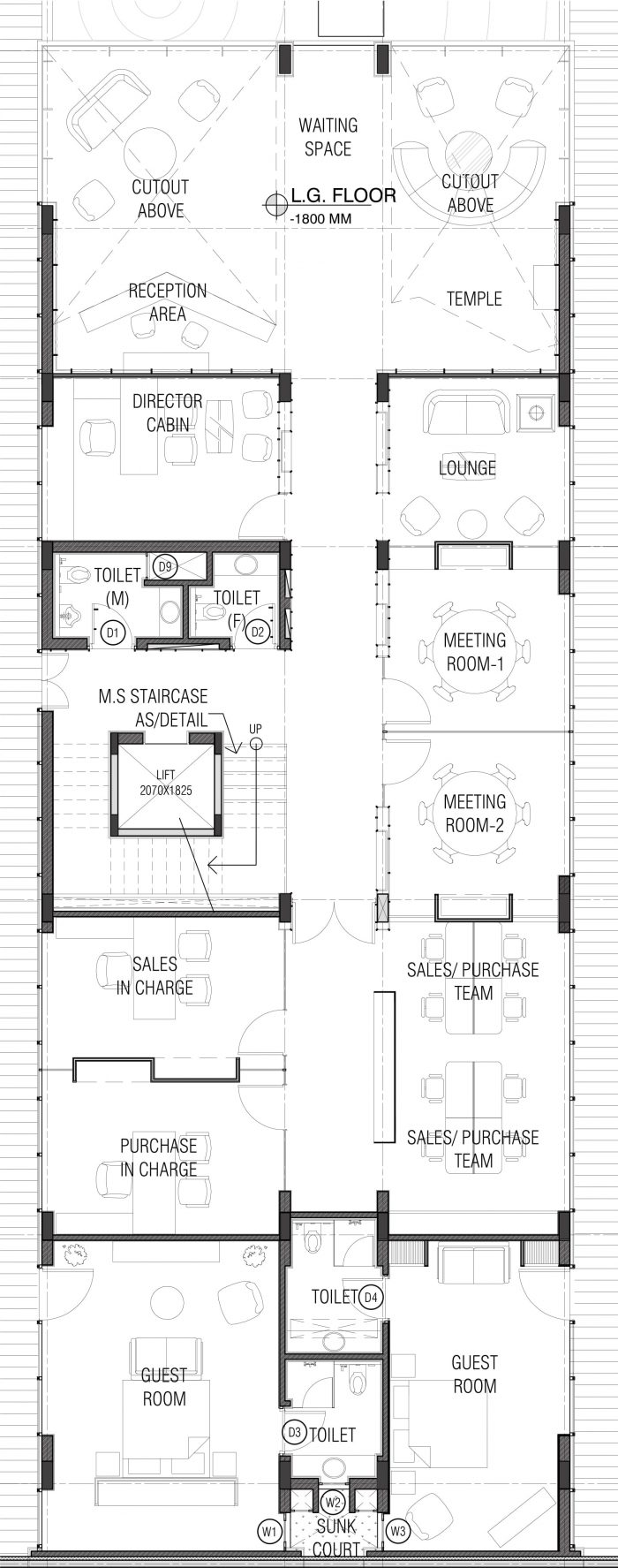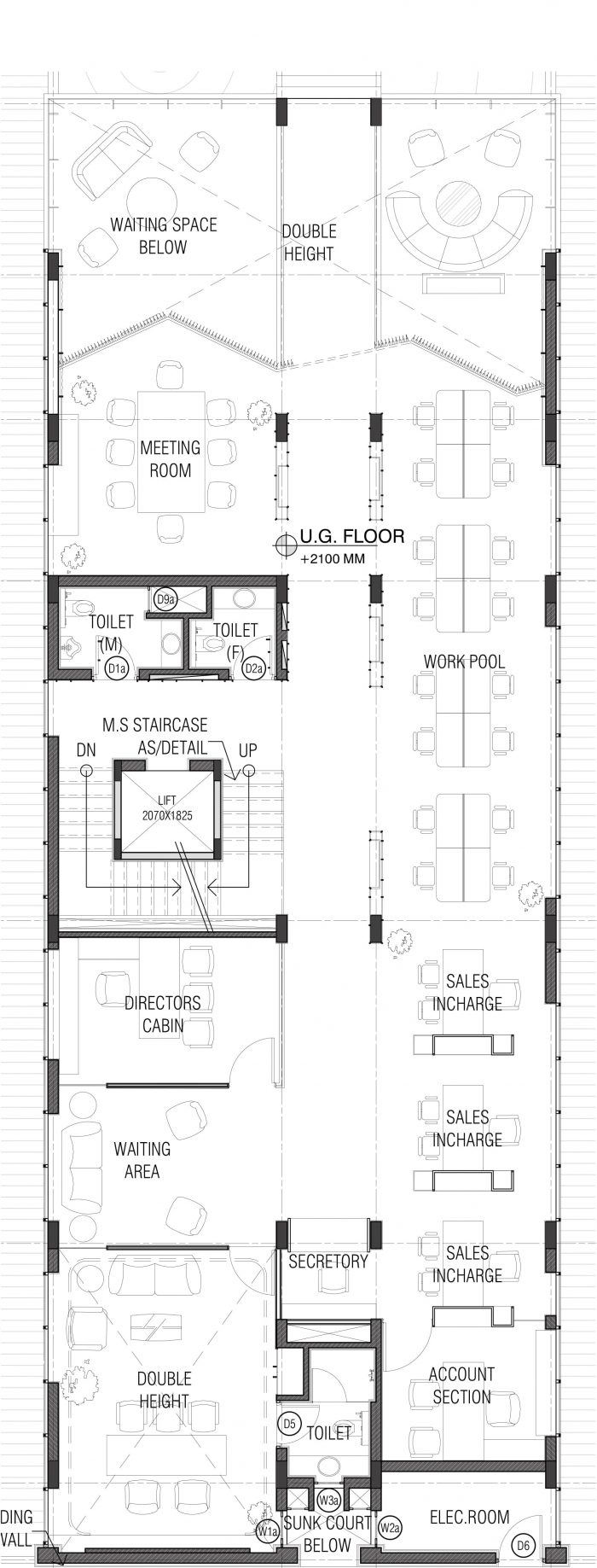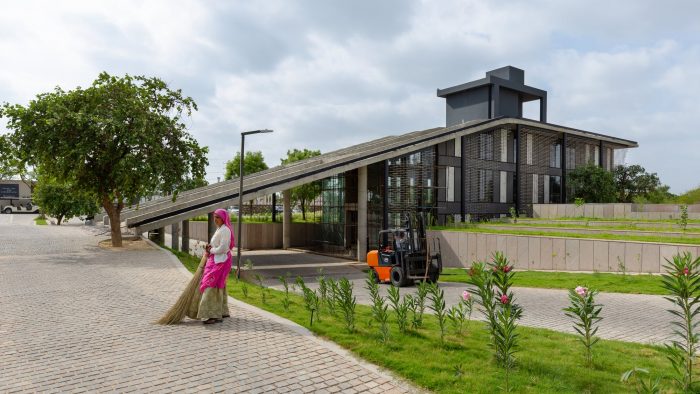 Other sustainable measures include the use of bio STPs that recycle waste water and use it for flushing toilets; rainwater harvesting techniques keep the groundwater table recharged; solar panels installed on the roof generate about 1 megawatt of energy (sufficient enough to fulfill the power requirements of the factory). Representation: The Office. The design of the building revolves around the concept of mutually respecting the surroundings and nature. The built form is raised and sunk into the ground away from trees already existing on site.