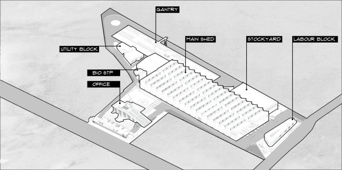 Stonex India’s administrative and industrial complex serves as an eminent landmark in Kishangarh. Product of simultaneous interactions between dynamic ordering of principles across varying systems and scales, and responses towards the site, the complex succeeds in carving out a niche of its own amidst the industrial landscape. Production: The Industrial Shed. Adhering to exigencies of site and logistically sound planning the manufacturing block orients rather unconventionally in the East-West direction.