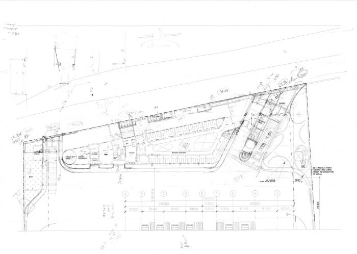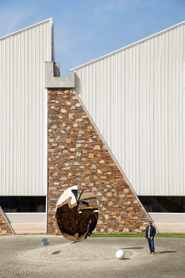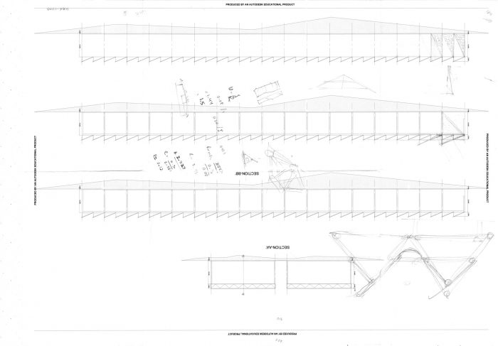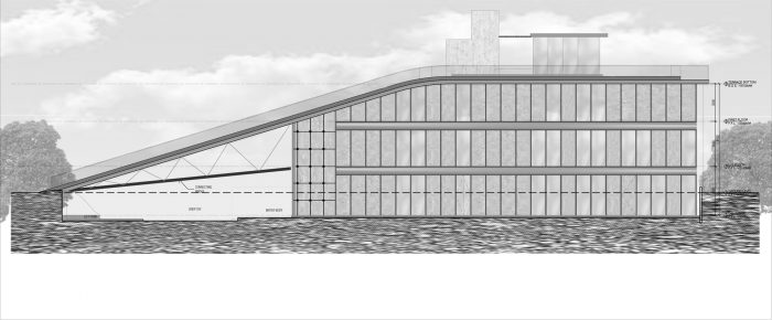 The orientation is strategically exploited by incorporating complementary systems: North light trusses are introduced, sloping at a suitable angle of 23 degrees towards the south providing for ample surface for photovoltaic panels. Prefabricated white metal flutters give the entire structure a buoyant profile, when looked at from afar. The stone buttresses make the building appear grounded at a more proximal viewing.