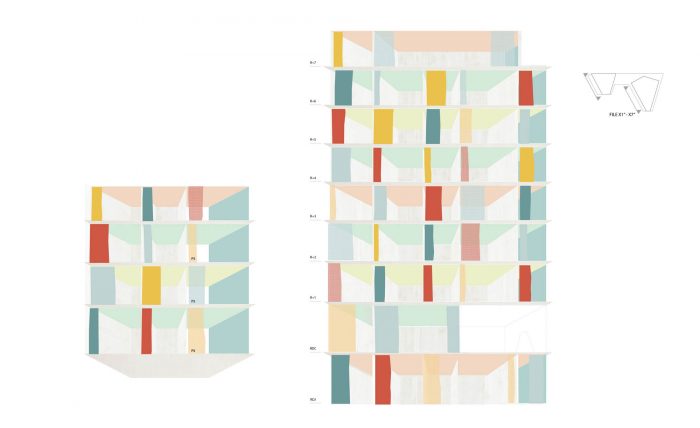 The heights of the building are defined by the street’s minimal distance rules: R+4 rue des Pavillons, R+7 rue Pelleport. The difference of height is even exaggerated by the one level difference of ground, which seems to add another level when seen from the courtyard. The housings are sharing common principles, declined in several typologies. Besides the studios, they all have double orientations, with generous exterior spaces – terraces and loggias –. They let the light in, with a mainly east/west orientation. The volumetric fragmentation of the project allows a large variety of typologies, in each case with its own particularities and relations with its environment.