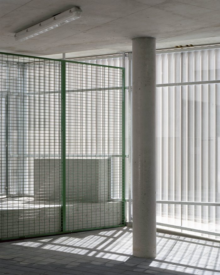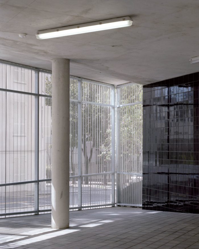 Visible from the rue des Pavillons but in the tranquility of the heart of the block, the garden is a quiet space. The whole ground floor is a generous free space for the inhabitants, with a green area. Sometimes with a roof, sometimes opened on the sky, it becomes courtyard, garden, bike garage, and playground.