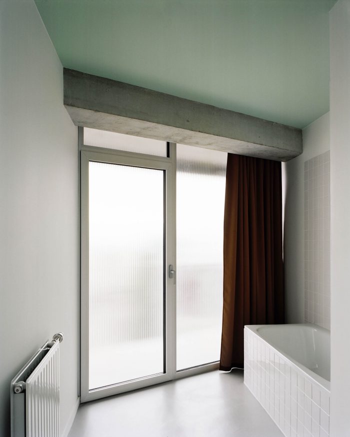Restrained by questions of density and efficiency, the project’s profile is entirely defined by the street’s minimum distance rules. As a result, two vertical prisms compose the main geometry, linked by a thinner central building orientated toward the garden and the light (thanks to a six meters step back from the street).