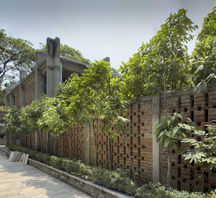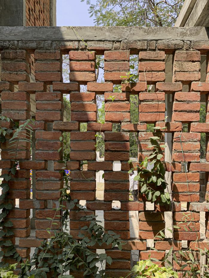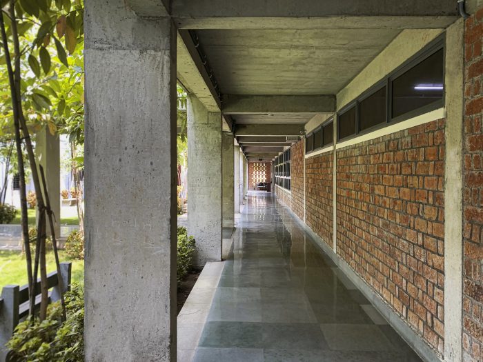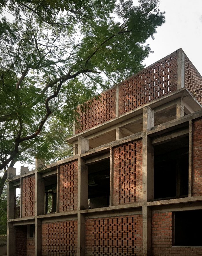 A modest study center nestled in the trees has been purposefully removed from the main building to provide isolation and sanctity. A temple for meditation along with a water body is placed between the old and the new built. Washrooms are planned to face the greenery towards an enclosed courtyard made of brick jaali. The structural system is kept simple and modular to allow seamless vertical expansion in years to come. Form finished concrete and exposed brickwork with local bricks impart an earthy and grounded look to the building. Rat trap bond brick masonry provides thermal insulation besides saving on bricks. Not to mention the saving on the plaster or paint now and in the future.