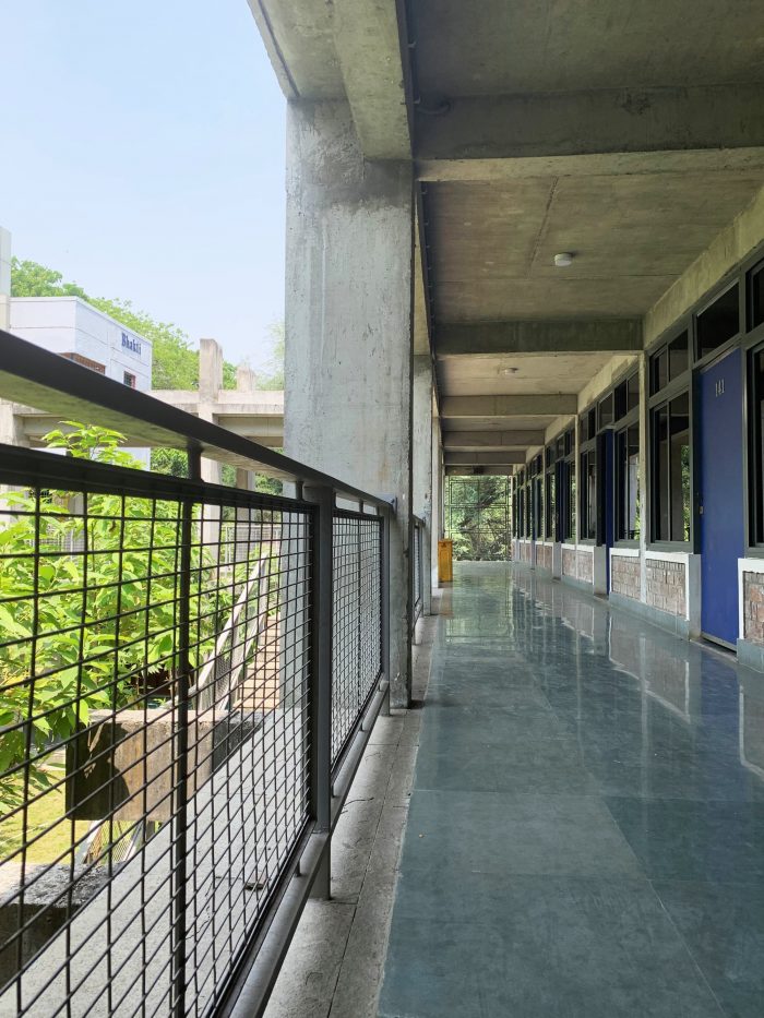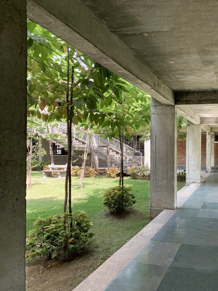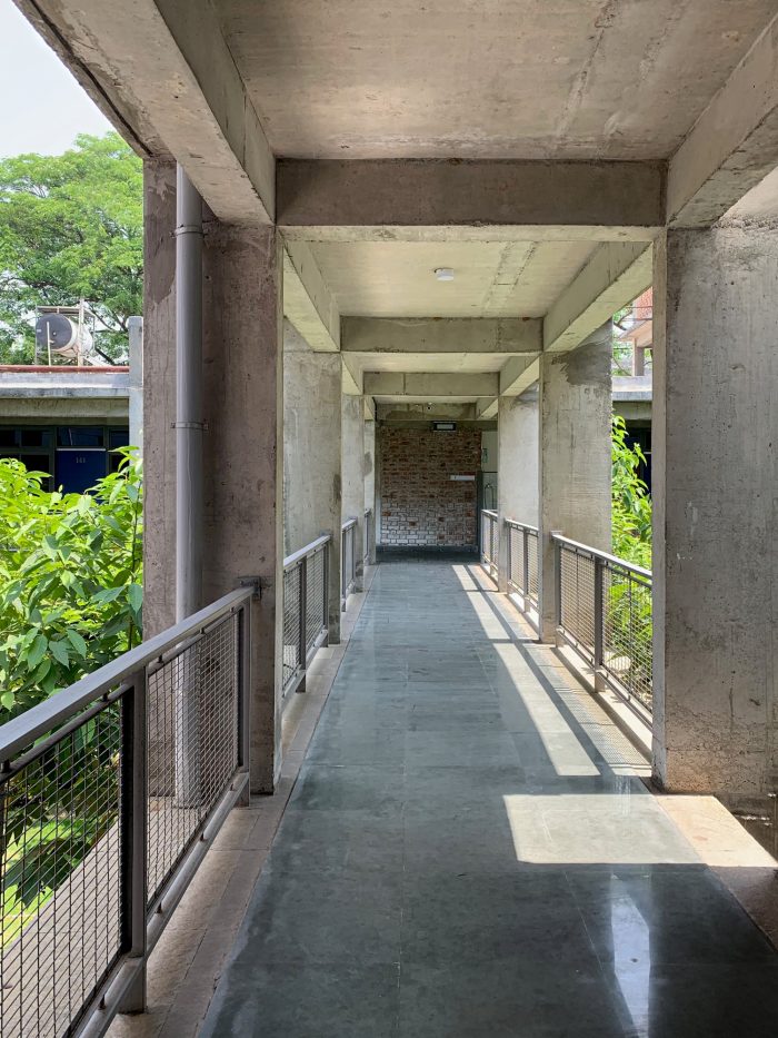 The new building was planned at a distance from the existing hostel with bridges connecting the staircases of the old hostel. This placement creates a series of courtyards punctuated by connecting bridges. The dormitory on the upper floor has a connecting corridor on the courtyard side while it also has a wide balcony on the tree-lined side for studies, other activities, and drying clothes in a dignified manner. The corridor acts as a buffer in the extreme heat during summers and provides space for carrying evaporative cooling ducts to the dormitories. An open staircase is designed in one of the courts.