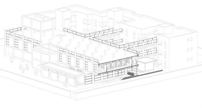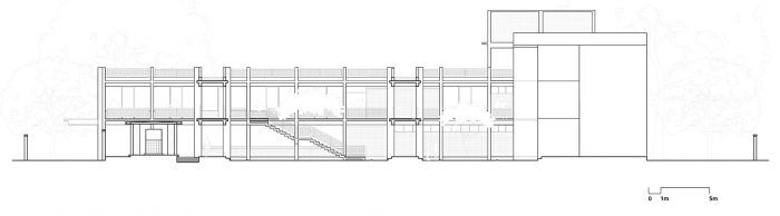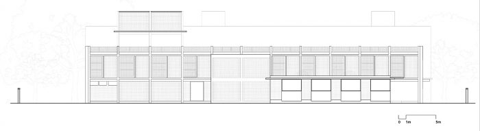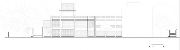 新建筑的规划与现有的宿舍有一定的距离,有桥梁连接老宿舍的楼梯。这种安置方式创造了一系列的庭院,并以连接桥作为点缀。位于上层的宿舍在院子一侧有一条连接的走廊,而在有树的一侧也有一个宽大的阳台,用于学习、其他活动和有尊严地晒衣服。走廊在夏季的极度炎热中起到了缓冲作用,并提供了将蒸发式冷却管道输送到宿舍的空间。在其中一个庭院中设计了一个开放的楼梯。