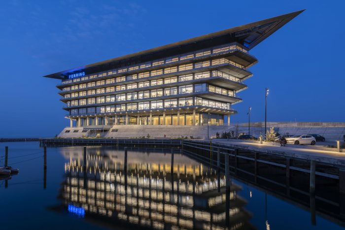 Ferring Pharmaceuticals A/S home in Copenhagen. The site occupies a pivotal waterfront position alongside the Øresund crossing, just north of Copenhagen International Airport. Bordered by predominantly low-rise development, the building affords fantastic views towards Malmö and the Swedish coast – where the company was founded.