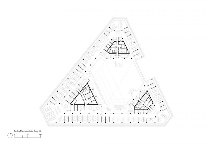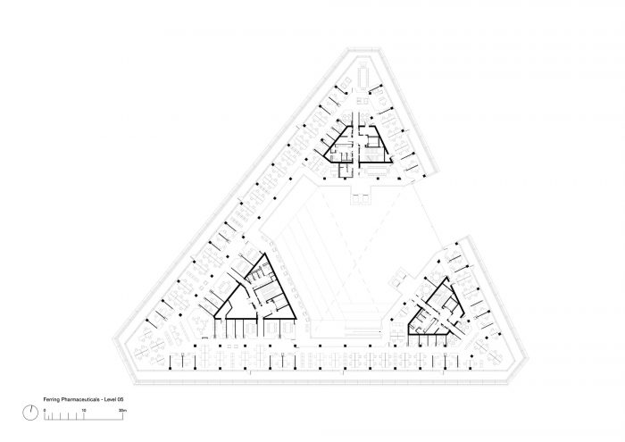 三角形的建筑形式是由场地的形状驱动的,四面环水。 在建筑的中心,宽敞的内部中庭包含了一堵全高的墙,可以看到瑞典的景色,一个入口大厅,一个餐厅,一个休息空间,以及餐饮会议设施和社会活动空间。中庭的边缘被设计成可以灵活使用。工作人员可以轻松有效地重新配置这些空间,将座位和桌子移到不同的位置。通过特色楼梯或玻璃升降机可以到达上面的楼层,这进一步活跃了中庭空间。