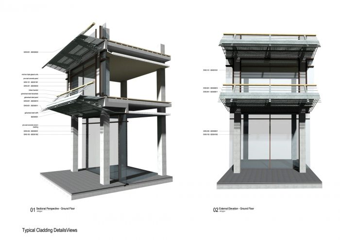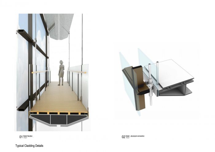 The building sits on a large plinth which acts as the first line of defense against potential floods. The design integrates robust street furniture and resilient soft landscaping, which response to the harsh marine environment. The lightweight glass building ‘floats’ above, in contrast to the heavy plinth below. The six stacked floors and roof canopy cantilever out to further capture the surrounding views and generate self-shaded spaces on each floor. This also creates a dynamic atrium space inside the building.