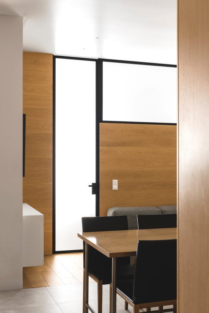 餐桌与厨房岛相连。一张小巧的转角沙发构成了起居室。在狭小的空间里很难维持秩序,因此我们设计了许多隐藏式储物系统。尽管面积不大,但这个房间看起来却很宽敞。室内隔断上部的窗户透出自然光,将沙发区和父母的卧室隔开。
