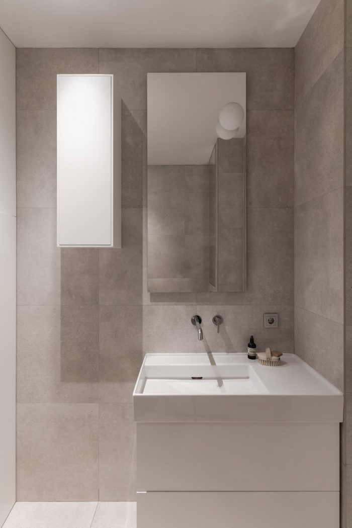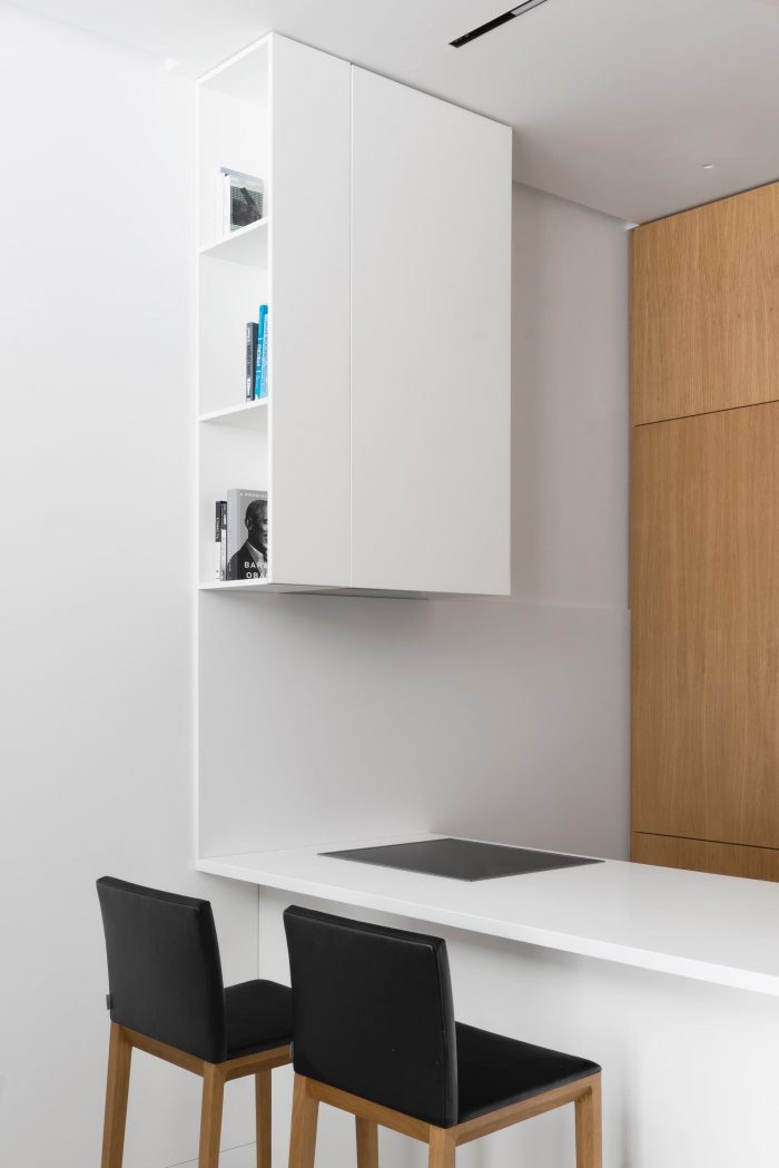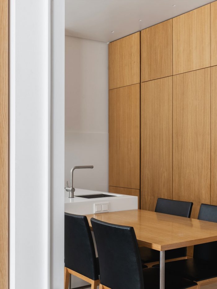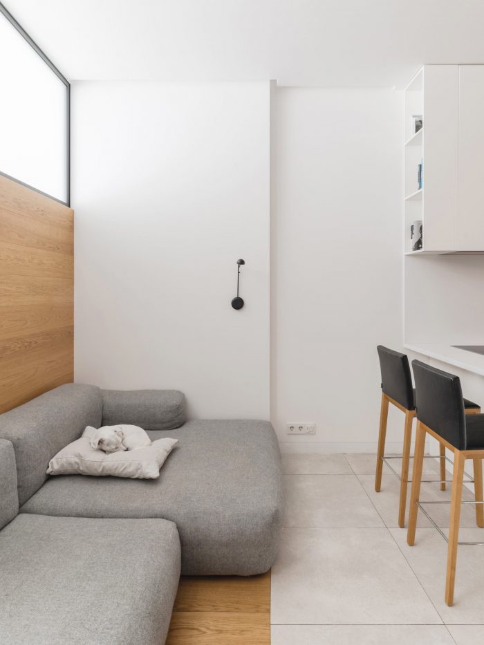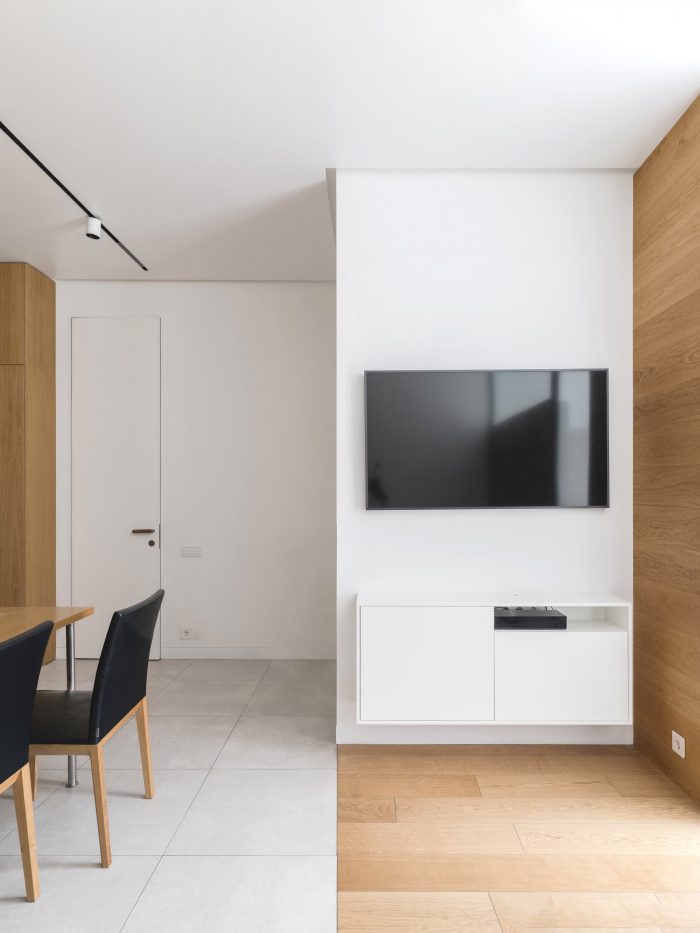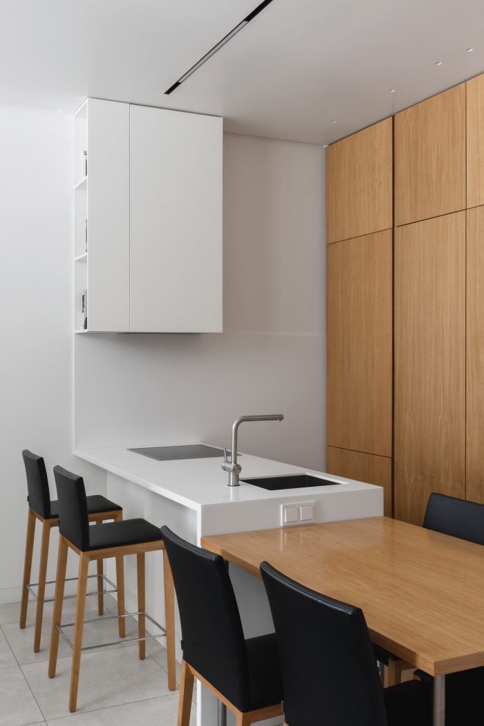 The interior of the apartment is minimalist, and even austere. The same floor tiles are in the kitchen area and in bathroom, walls are white, and furniture is made of wood of the same color tone as floorboard.