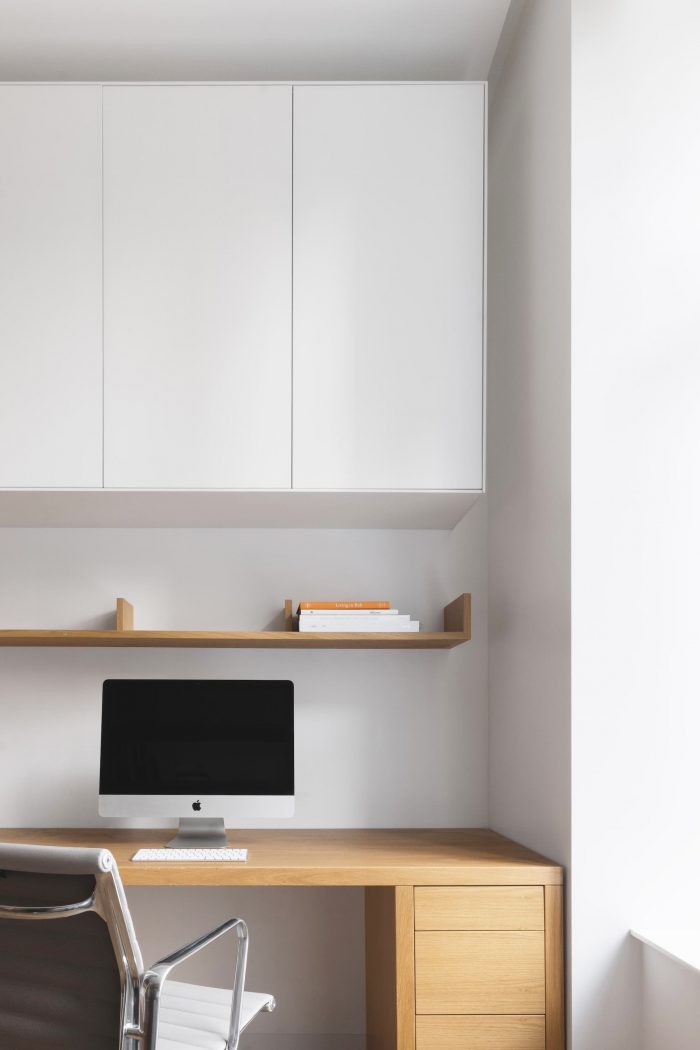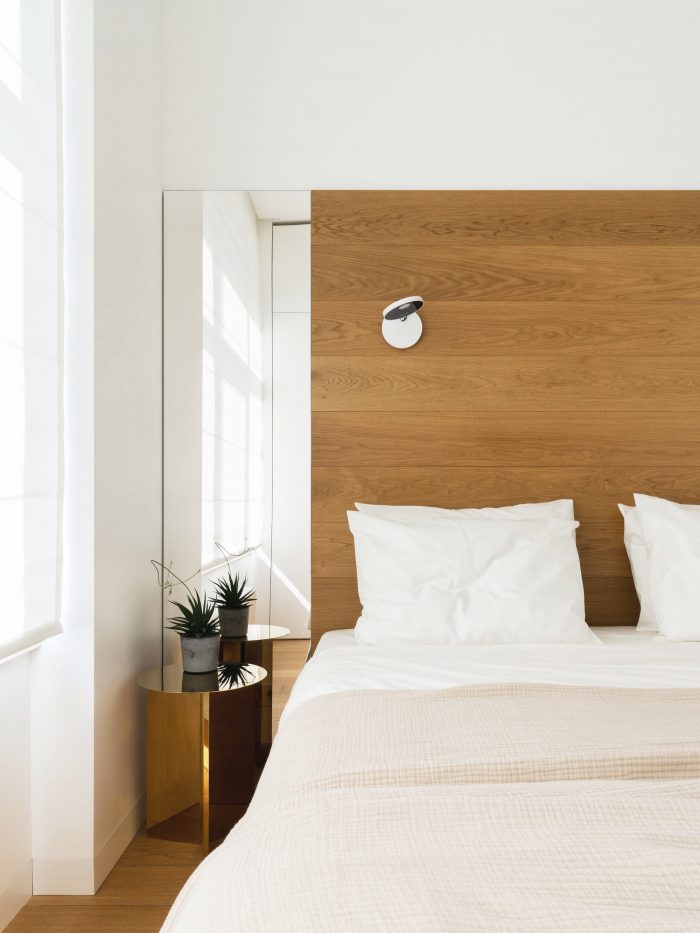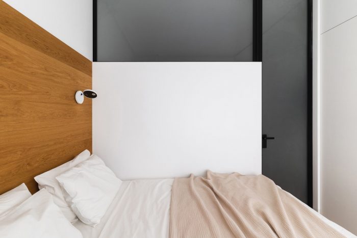 父母的卧室是公寓里最小的房间,其中一面墙完全被嵌入式衣柜占据。白色和没有任何细节的外墙隐藏着宽敞的储物格。床后的镜子让空间在视觉上变得更大。