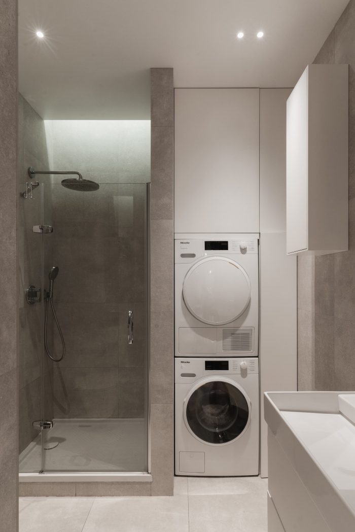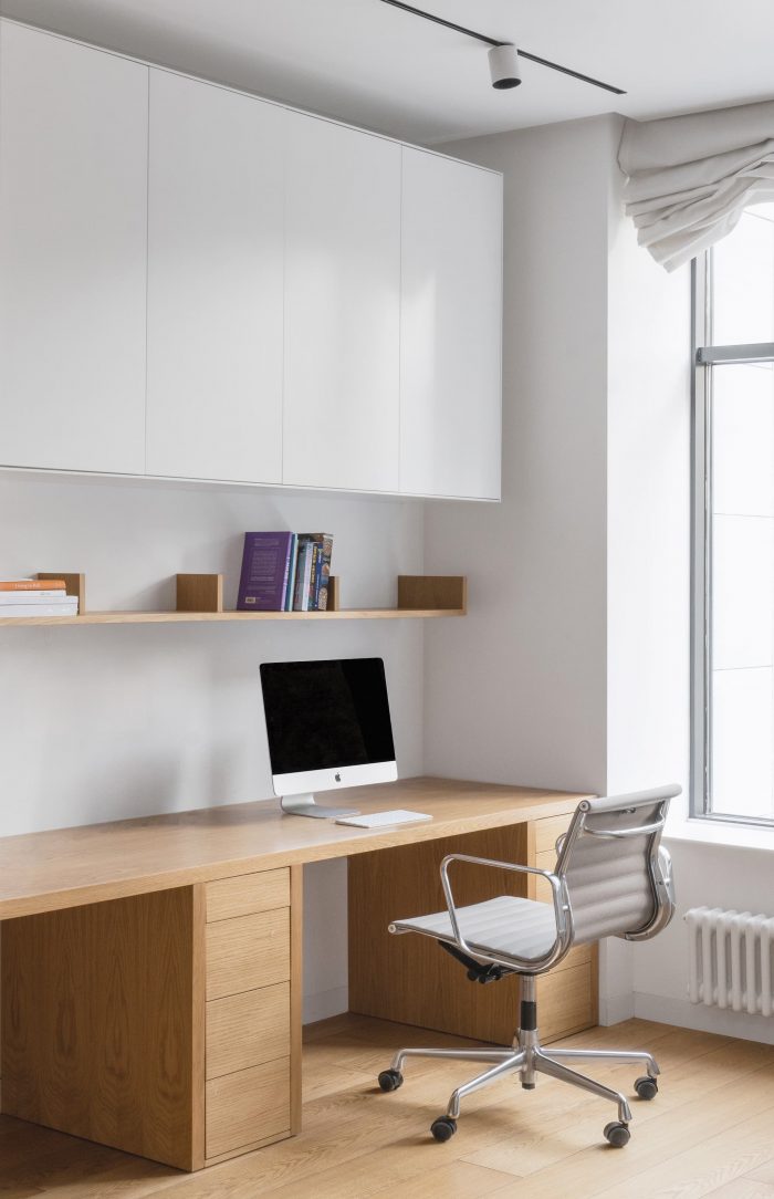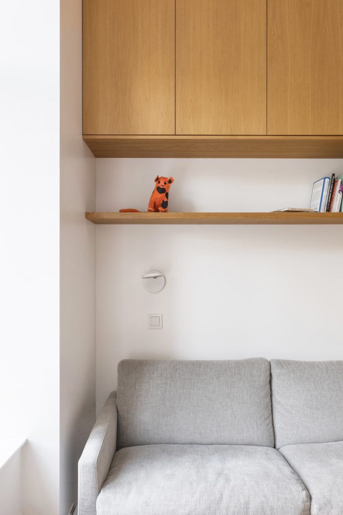 Although the area is limited and the apartment has only two windows, the clients asked us to place all required functional zones: a kitchen-dining room, a sofa area with TV, a parents’ bedroom and a children’s room, including a folding sofa for a nanny and areas for playing and studying, a bathroom with a loundry zone, plenty of storage systems. But, nevertheless, the aesthetic quality of the space is as important for the clients as its function, because the family spends a lot of time in it.