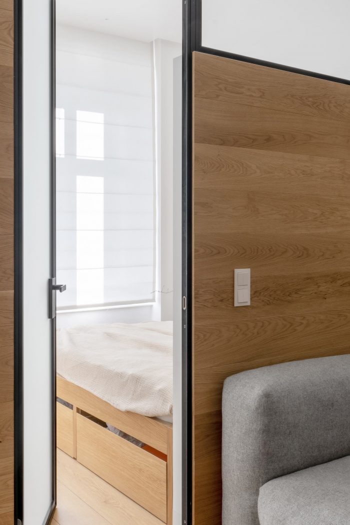 The common room combines the functions of living room, dining room, kitchen and hall. We combined the kitchen cupboards and the wardrobe into a single wooden volume and placed it at the entrance to the room.