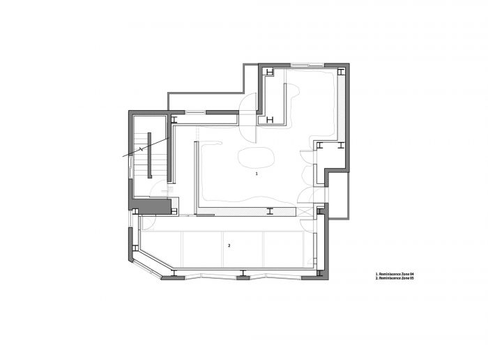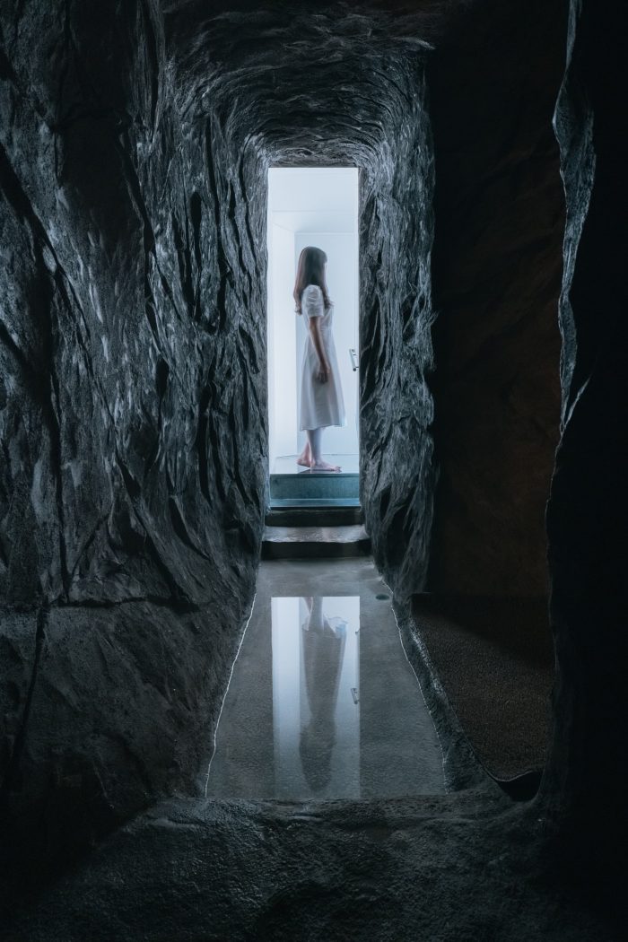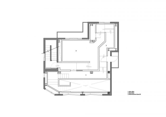 B1--当你下到地下室的时候,在地下室第一层你会遇到的空间是深沉的地面和深沉的夜。根据指导,所有的观众将脱掉鞋子,光着脚丫子进入 "住世 "的空间。他们将通过黑暗、无视、漫长的通道,而完全依靠蜡烛和手脚尖的感觉。在抛开周围模糊的恐惧的同时,迈出一步需要勇气。此刻,脚趾共传递了三种不同的感觉,地面与脚接触的触感非常新鲜。此外,随着脚部感觉的变化,你也能体验到进入你耳朵的声音片段是如何变化的。在通道的尽头,有一个用于冥想的空间,你可以放下你在通过通道时依赖的蜡烛,在看着蜡烛时花点时间清理你的感官。闪烁的蜡烛抚摸着模糊的人物,观众可以感觉到自己模糊的感官逐渐变得清晰起来。穿过冥想空间后,一个将空间和时间背景最大化的地下空间出现。建筑物的空隙空间被用来在黑暗的地面上创造出一个缺口,夜空被打开。