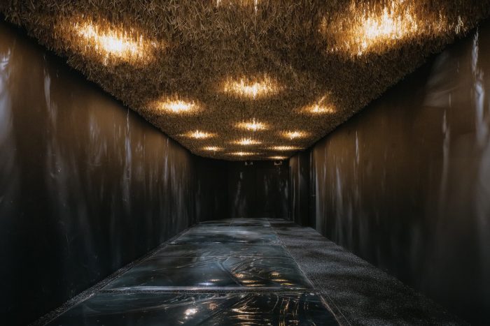 B1 - When you go down to the basement, the space on the first basement floor you will encounter is deep ground and deep night. According to the guidance, all the spectators will take their shoes off and enter with bare feet to the space of Sumsei. They will pass through the dark, sightless, and long passage, while solely depending on the candle and sensations from the tips of their hands and feet. It takes courage to take a step while leaving behind the vague fear that surrounds you. At this moment, the toe transmits a total of three different senses, and the touch of the ground coming in contact with the foot feels very new. Furthermore, as the sensation of the feet changes, you can also experience how the pieces of sound that enter your ears change. At the end of the passage, there is a space for meditation where you can put down the candle you depended on while passing through the passage and take a moment to clear your senses while looking at the candle. The flickering candles caress the blurry figures, and the spectator can feel their vague senses gradually becoming clearer. After passing through the meditation space, an underground space that maximizes the spatial and temporal background appears. The void space of the building was used to create a gap in the dark ground where the night sky was opened.