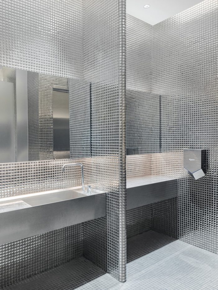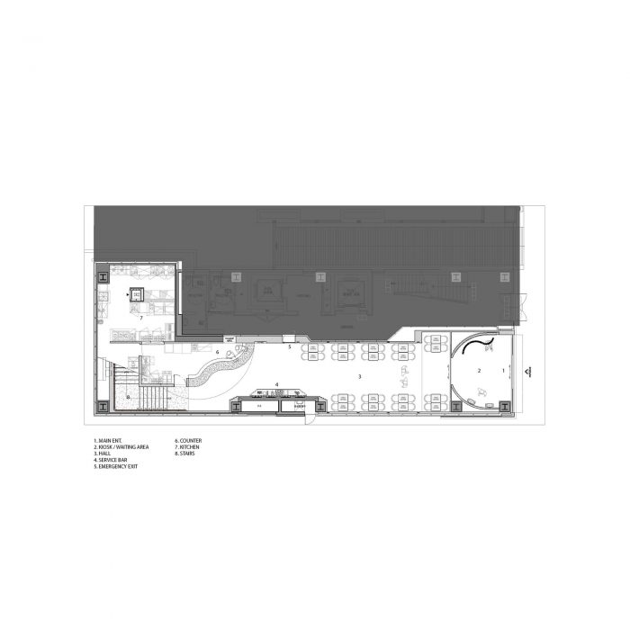 功能 - 顾客可以根据自己的选择,在一个具有不同情调的空间里享受用餐体验。空间被分为一楼和二楼,以拥有差异化的空间情调。我们在一楼创造了砖块空间,逐渐用渐变的色调完成。在二楼,我们为顾客提供了不同的座位选择,如木质嵌入式的温暖情调,金属墙面的卫生情调,以及使用金属马赛克瓷砖墙面的未来情调。我们在设计布局时考虑到了客户的便利性,在一楼和二楼分别放置了信息亭,这样客户就可以在最方便的位置下订单,无论他们坐在哪里。通过战略性地使用商店内部和橙色,我们在空间内强调了品牌的颜色,并产生了影响。