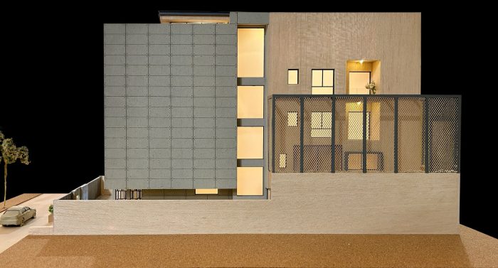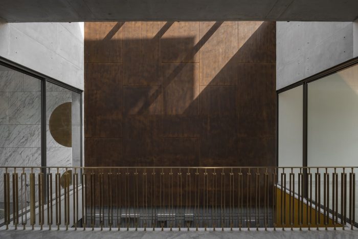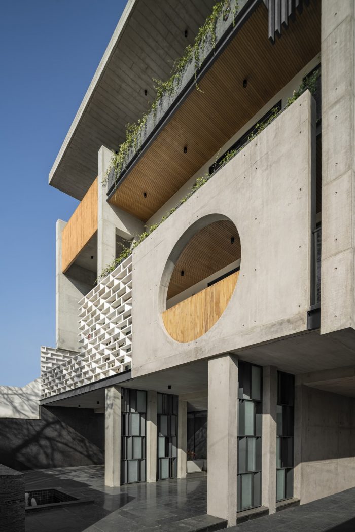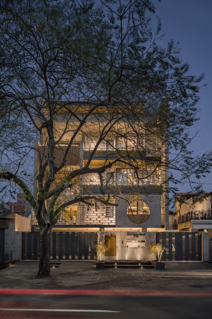 The front elevation provides a true image of its interiors, with jali and circular cut-out, creating an interactive exterior that arouses a hint of curiosity among every passerby. Well-known architectural concepts like minimalism, brutalism, and modernism are reinterpreted and amalgamated into a design that breaks the norm of residential projects in the city to create a building that speaks for itself yet remains a private home to a family.