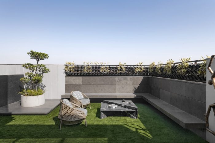 The ground floor is spatially designed to accommodate major public areas with a cut-out that shifts across the floors, providing green elements and a visual connection to all the spaces. The balconies do not merely provide access to the outer views but include the outer scapes as an element of the design itself to the interiors. The pre-existing trees around the site are used to maintain a level of privacy from the outside but at the same time provide a freshness of green to the spaces inside. The upper two levels provide an increased level of privacy for all the family lounges with bedrooms designed solely for the family members. The double-height balcony with its screens adds another dimension to the floor. The terrace level is kept as a complete recreational floor with amenities like a jacuzzi, halls, open seating areas, and such.