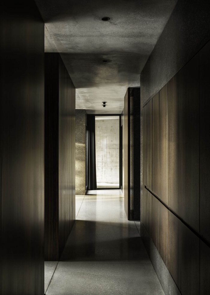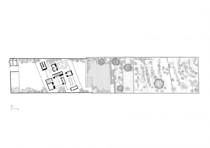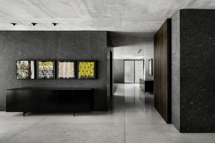 住宅内外的地板都是由浅灰色水磨石制成。两块混凝土板从墙到墙,由包含服务空间的黑色花岗岩块支撑。沿着从通道院子穿过房子并进入下面花园的路径,植被无处不在。