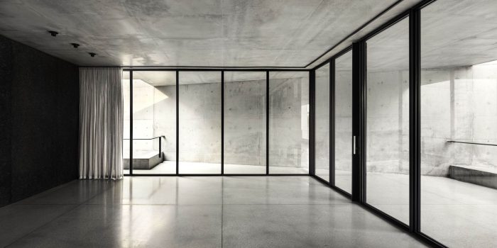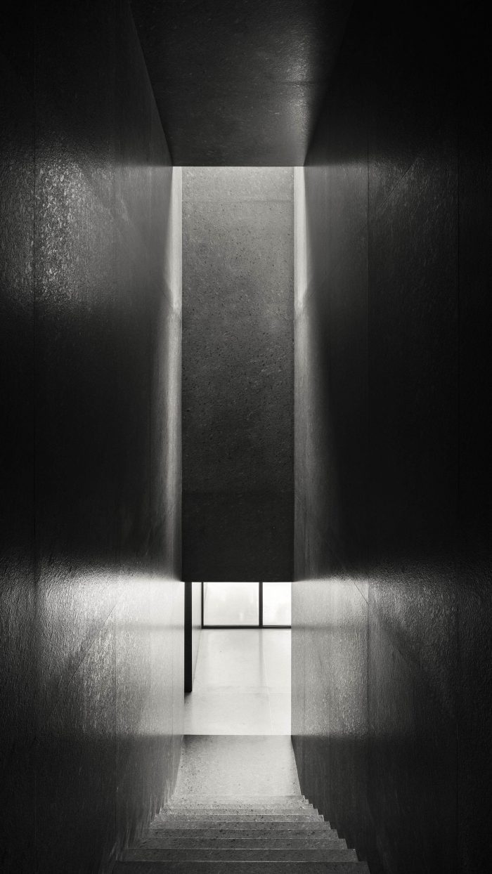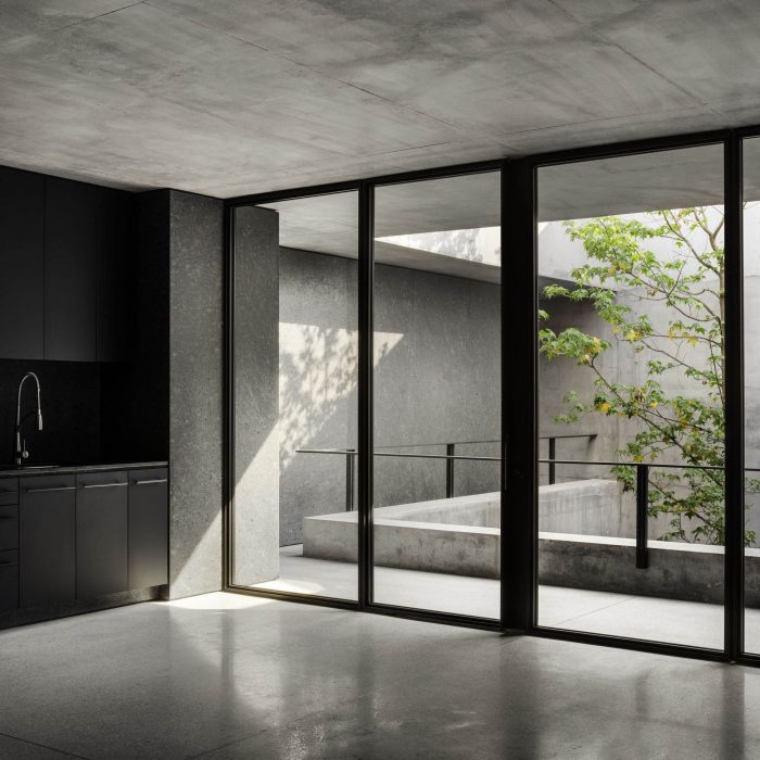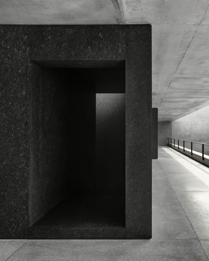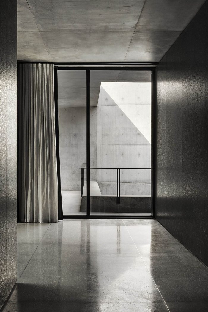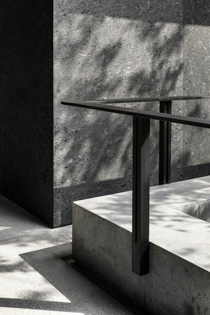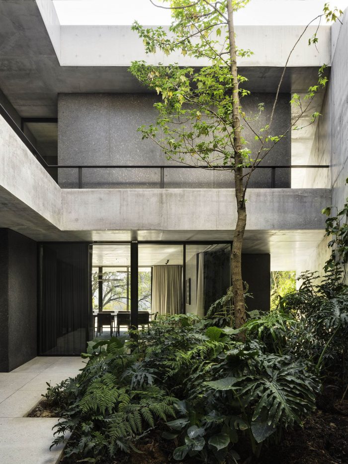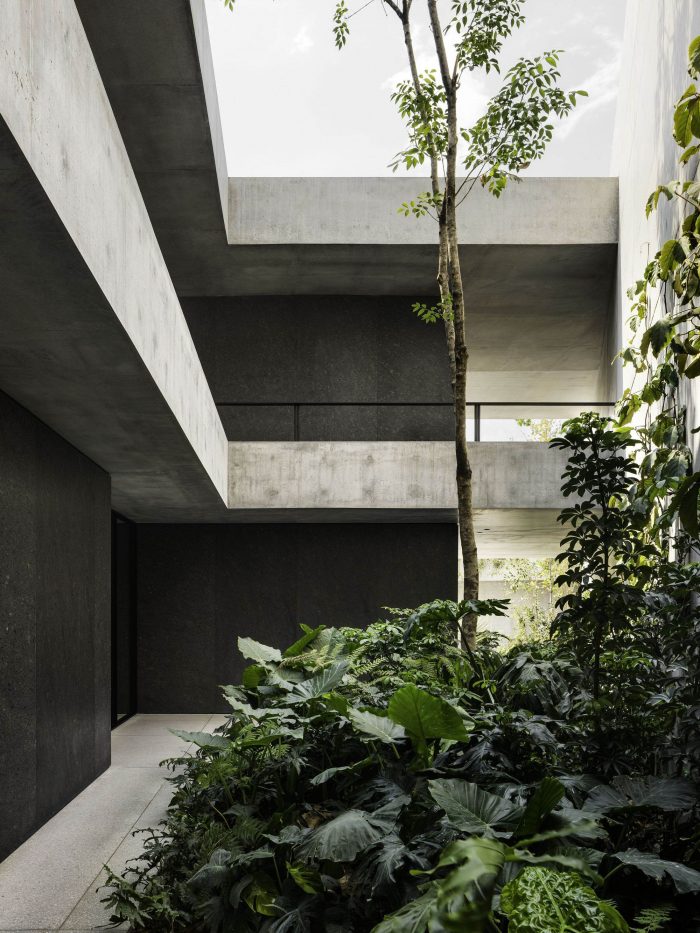 Both inside and outside the residence, the floor is made of light gray terrazzo. Two concrete slabs run from wall to wall and are supported by black granite blocks that contain the service spaces. Vegetation is omnipresent along the path leading from the access courtyard through the house and into the garden below.