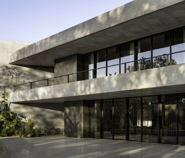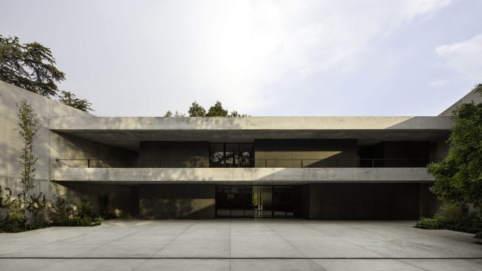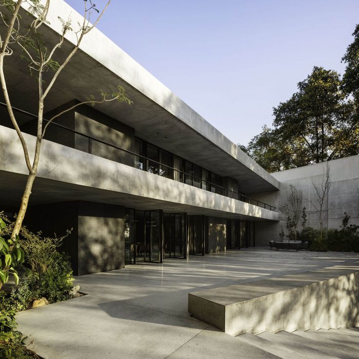 A platform, whose height is defined by the access from the street, forms the base of the residence. On three of its sides, concrete walls isolate the surrounding noise and provide a calm and serene atmosphere to the compound. This sense of calm is reinforced by the omnipresence of the plant element. On the avenue side, the wall becomes a façade. A horizontal folding gives it an austere, intriguing and sophisticated presence.