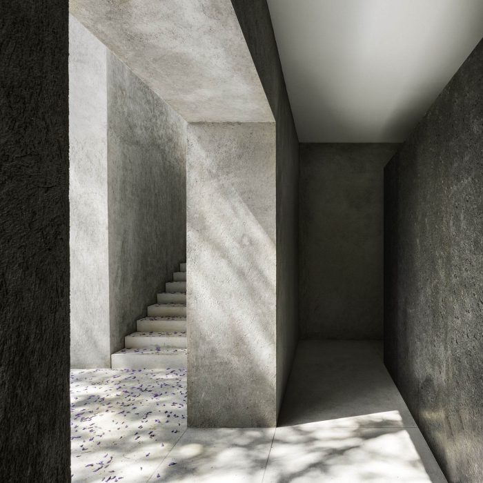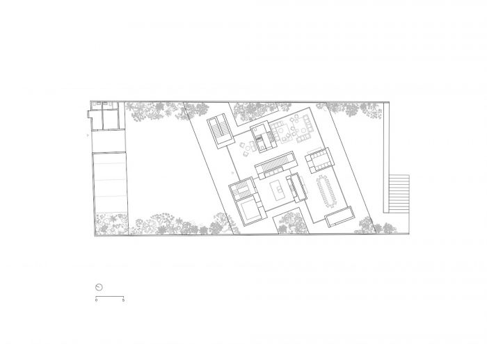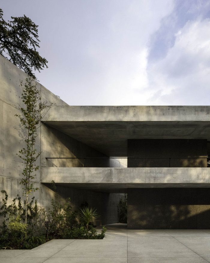 一个平台,其高度由来自街道的通道决定,构成了住宅的基础。在它的三个侧面,混凝土墙隔离了周围的噪音,为大院提供了一个平静和安宁的氛围。这种平静的感觉被无处不在的植物元素所加强。在大道的一侧,墙成为一个外墙。横向的折叠给了它一种朴素的、耐人寻味的和复杂的存在。