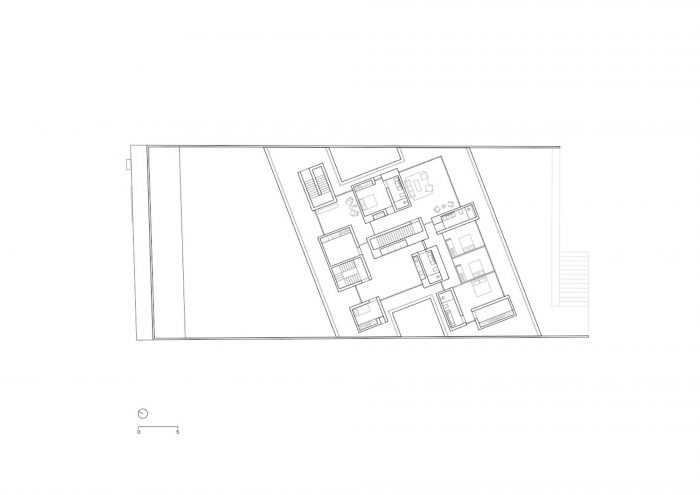 由于规范的原因,该住宅精确地尊重了以前住宅的足迹。虽然周围建筑的几何形状是由垂直于大道的地块明确定义的,但项目的实施是斜的,计划是一个平行四边形,占据了地块的宽度。