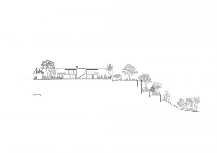 Between the blocks are the common living areas, where the visual relationship with the exterior is continuous. Large eucalyptus wood swing doors regulate the level of privacy of each space. A generous staircase provides a comfortable transition to the garden platform. A succession of cascading plateaus provides a gentle transition to the natural surroundings of the ravine.