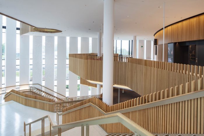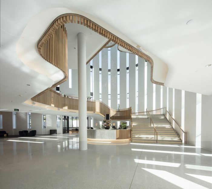 The design confidently rejects superfluous decoration and employs a purposely restrained use of three primary materials; timber, terrazzo and plaster. The dramatic interplay between layered mezzanines and sweeping staircases creates a symphonic quality to the interior, imbuing the heart and soul of performance into every inch of its built form