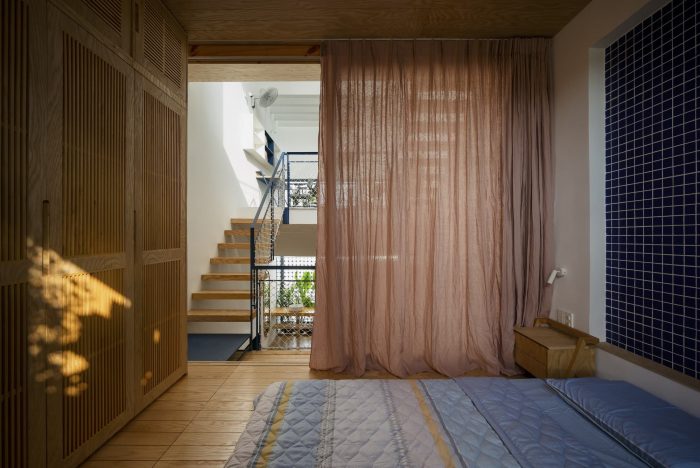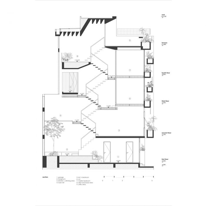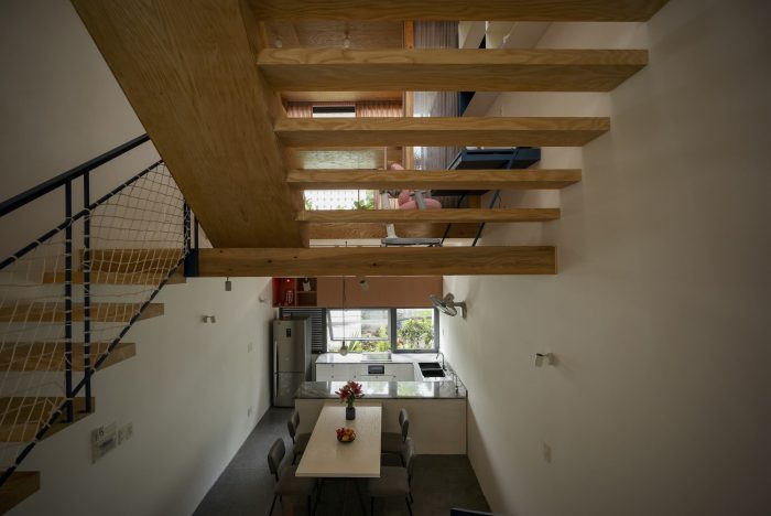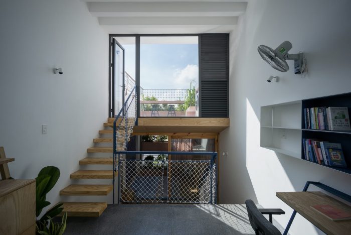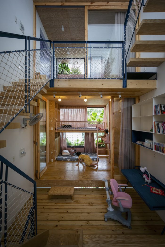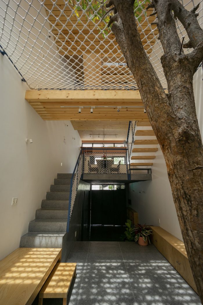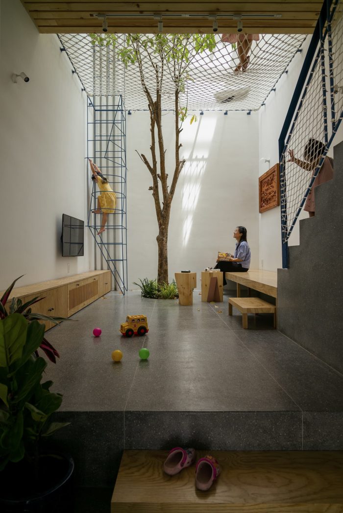 Limited in area, the structure of the house must grow in height to ensure the demand for functional use. Split floor layout with 11 floors assembled staggered vertically, linked by a flexible traffic system, thereby creating many spaces of different heights. The spaces for living and playing are arranged and intertwined. The higher you go, the more dense and private the space will be.