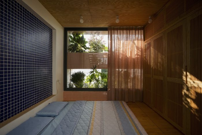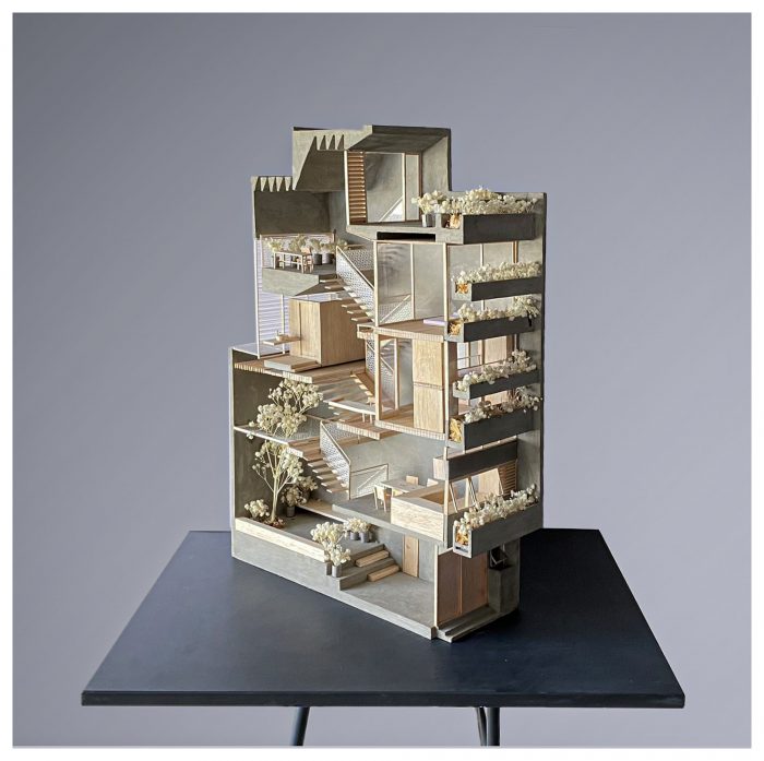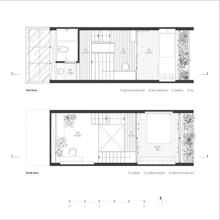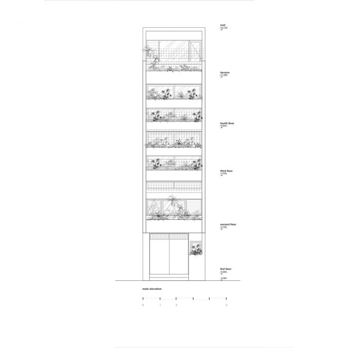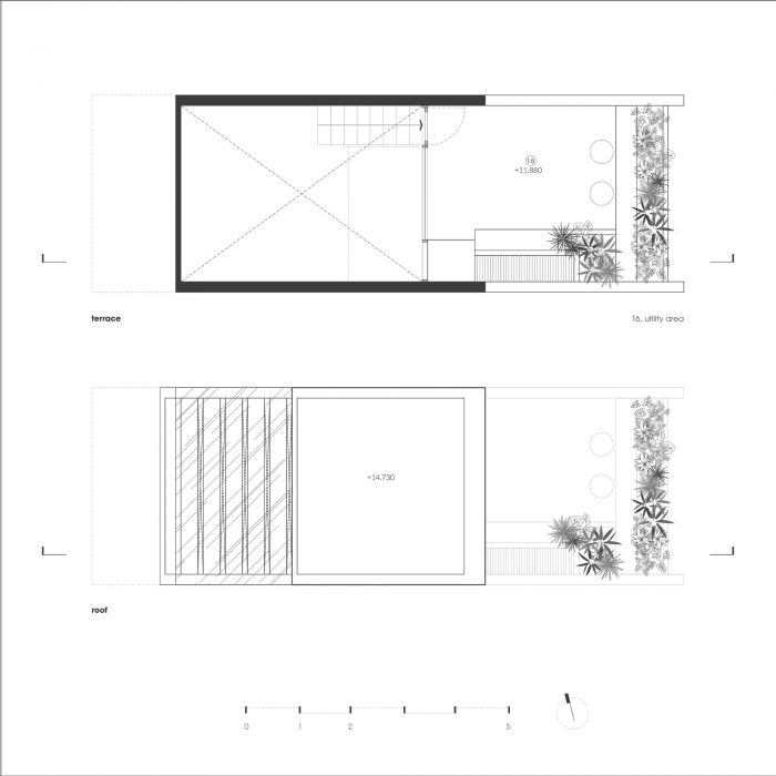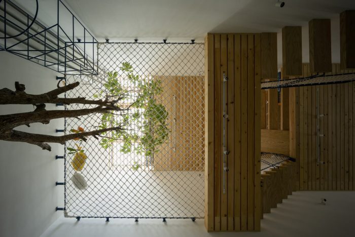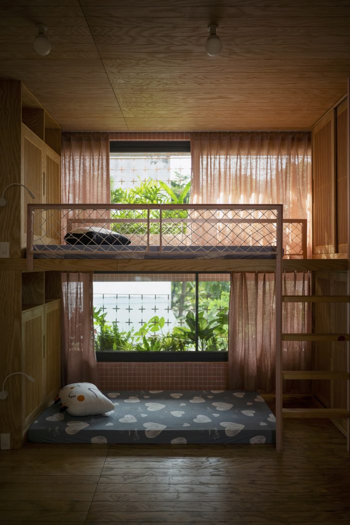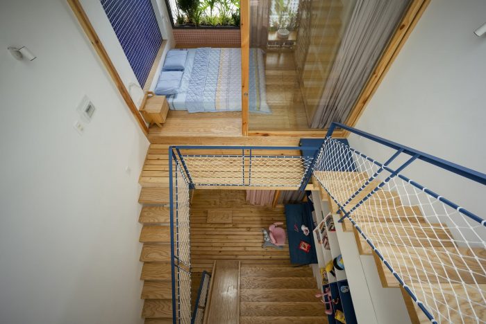Limited in area, the structure of the house must grow in height to ensure the demand for functional use. Split floor layout with 11 floors assembled staggered vertically, linked by a flexible traffic system, thereby creating many spaces of different heights. The spaces for living and playing are arranged and intertwined. The higher you go, the more dense and private the space will be.