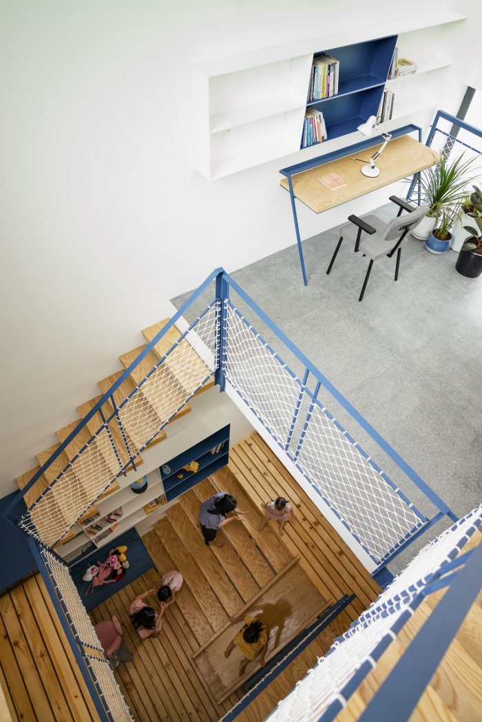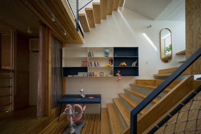 Traffic structures are modified and used as living spaces (playgrounds, libraries, ...) to help eliminate boredom when moving and erase the sense of separation between floors. The spaces are divided by "soft limits" from the elevation changes between the floor slabs - a floor structure that continuously evolves both vertically and horizontally. The floor definition is removed and replaced with a sequence of undivided living spaces. All that creates a general “atmosphere” for the house.