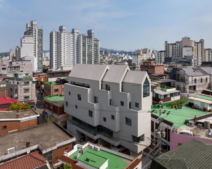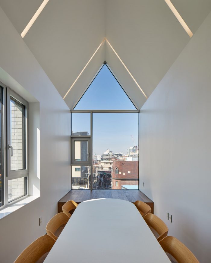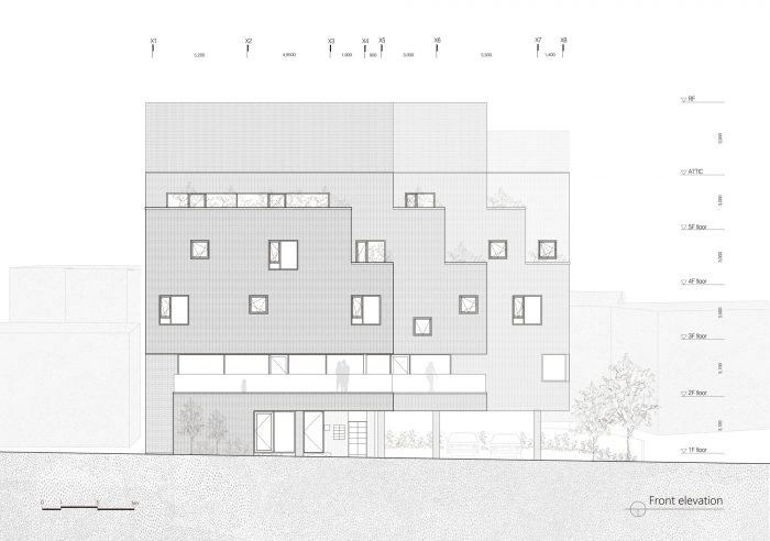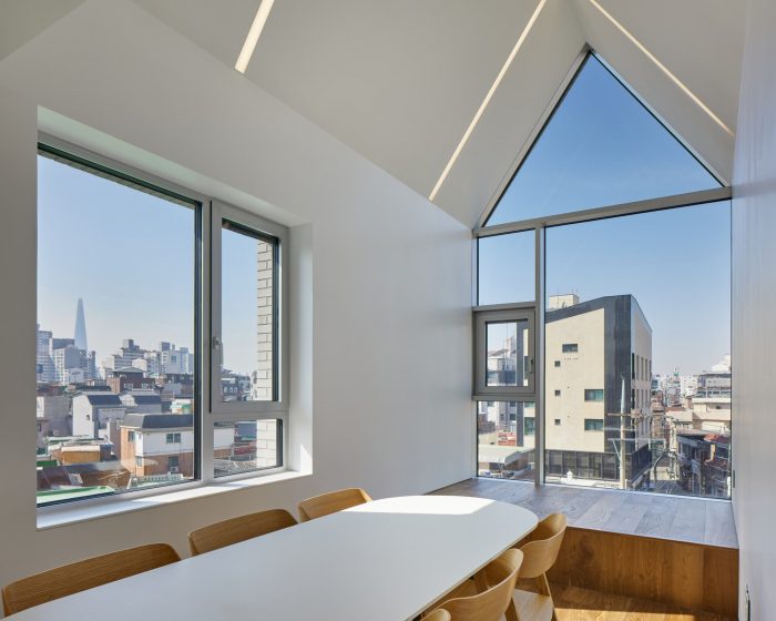T-Roof is characteristic of three roofs as shown in the name of it. Vertically separated mass in consideration of the scale of the existing city has been finalized with the same materials with an external wall in consideration of how the roof was regarded as one particular front view in the importance as a landscape shown from a high-rising office nearby.
