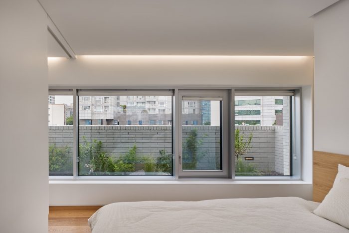 A narrow street in the back mixed with pedestrian and car roads is making an activated landscape of a city as roads and lives are closely related to each other. However, they have a poor pedestrian environment. T-Roof has planned a small public garden along the roadside, adding relaxation to the activated alley landscape. Small gardens at a patio for each generation serve a role of the landscape from public gardens in a city with high-rise buildings nearby.