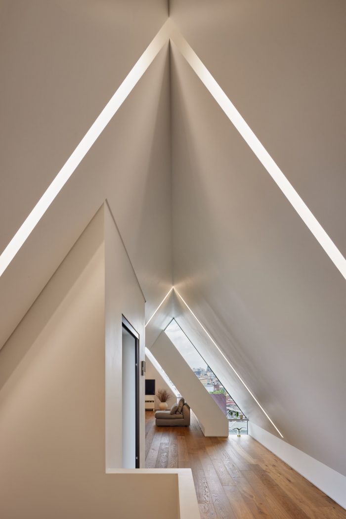 T-Roof是三个屋顶的特点,正如它的名字所示。考虑到现有城市的规模,垂直分离的体量与外墙采用相同的材料,考虑到屋顶被视为一个特殊的正面景观,从附近的高楼办公中可以看到它的重要性。